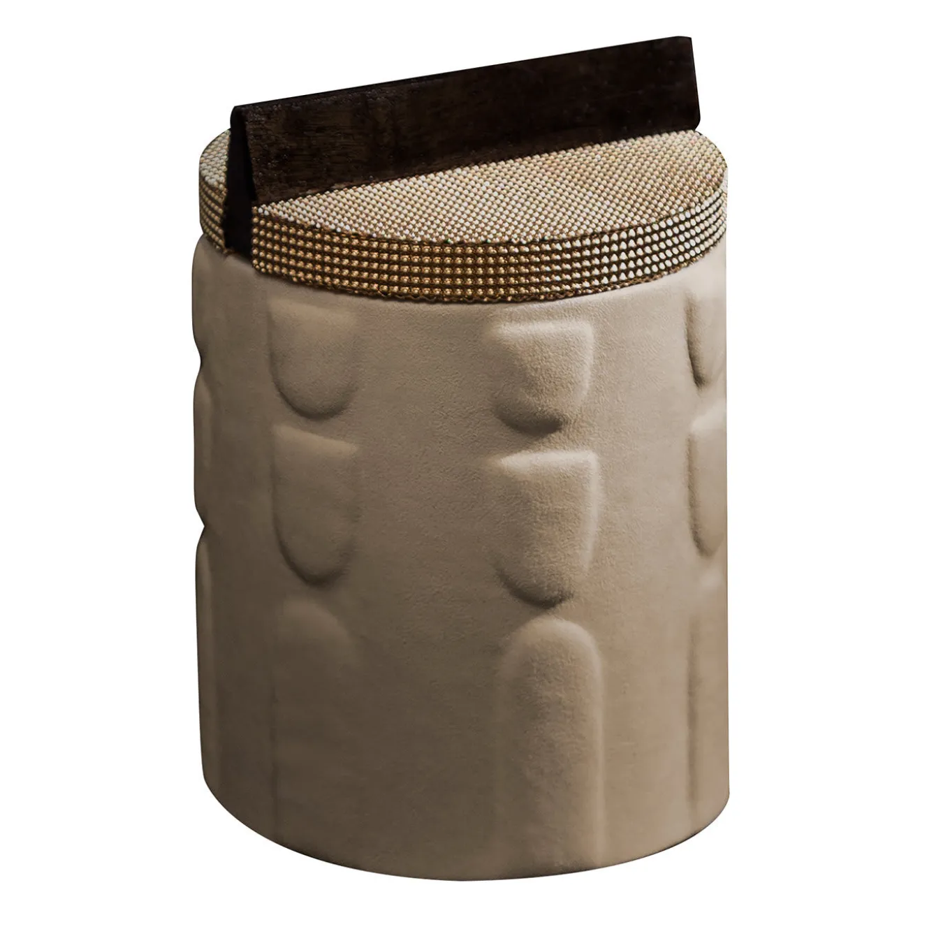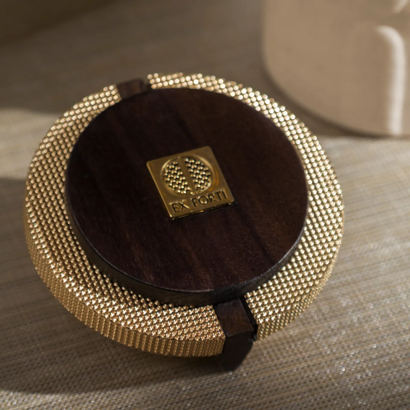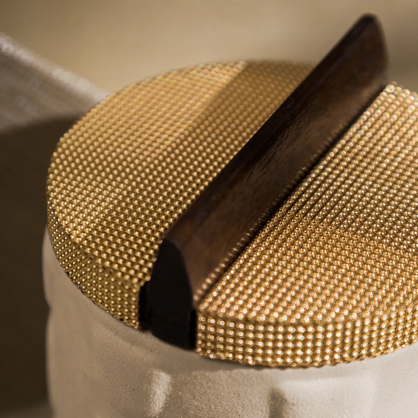 Una sapiente sintesi di scultura e architettura esemplificata da una scatola artigianale tanto piccola quanto preziosa. Un motivo a rilievo che richiama soggetti precolombiani aggiunge dinamismo testuale alla struttura cilindrica in noce canaletto, rivestita in pelle Nubuck beige per un’ottima sensazione tattile. Il coperchio in ottone offre una superba lucentezza grazie alle maglie altamente riflettenti che compongono il disegno a rete, interrotto solo dal lineare pomolo in legno il cui rigore è un omaggio alle linee razionaliste.