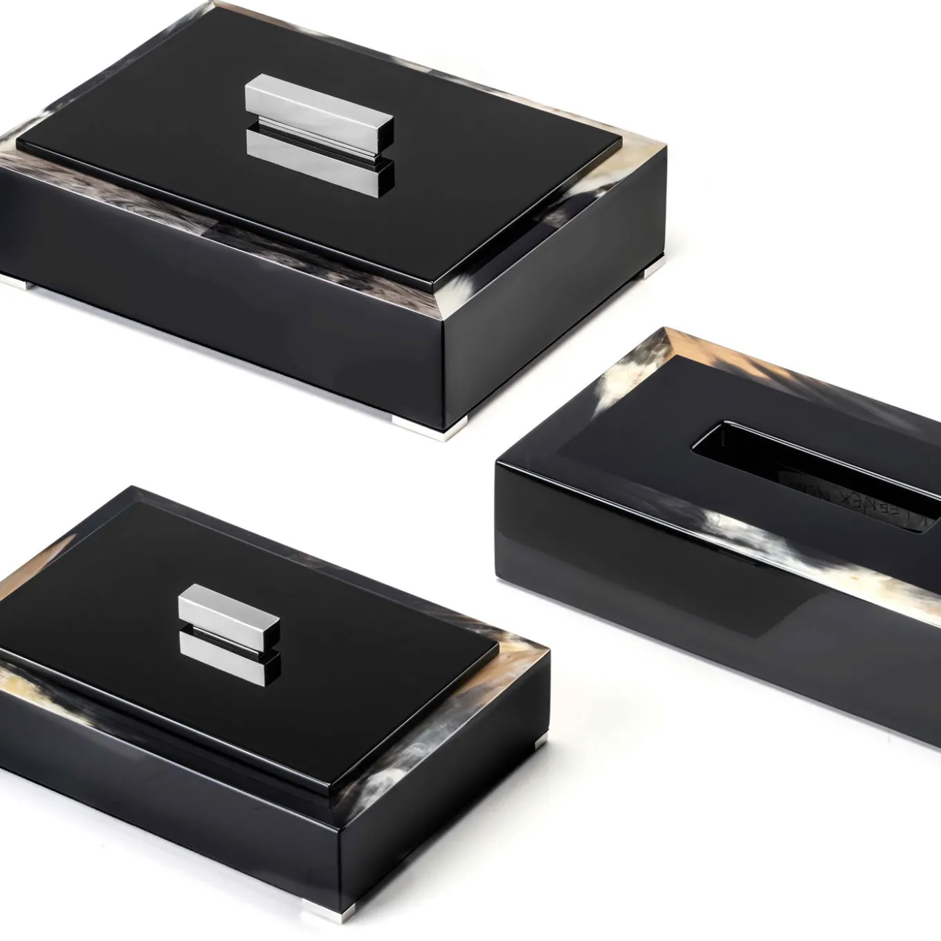 Questo raffinato cofanetto portaoggetti, realizzato con materiali di lusso interpretati con gusto moderno, è un complemento d’arredo di grande effetto per gli interni contemporanei. A forma di parallelepipedo, la scatola è composta da una struttura nera in legno e pregiato corno scuro con finitura laccata e lucida. La stessa finitura decora il coperchio in legno, dotato di una maniglia in ottone cromato. Il rivestimento interno in pelle Tosca completa questo oggetto sofisticato.