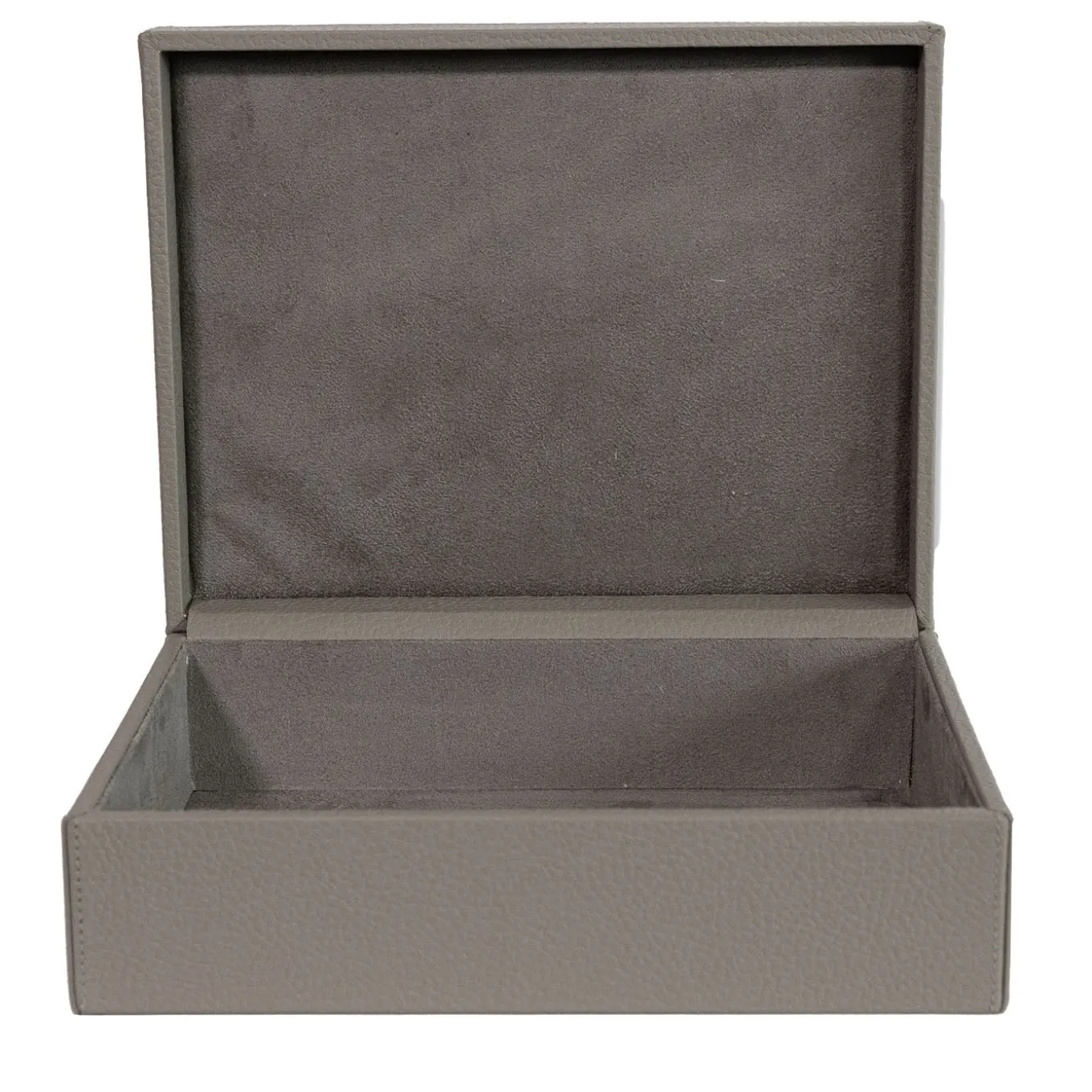 Scatola portaoggetti in legno rivestita in pregiata e morbida pelle, con un delicato intarsio artigianale sul coperchio. L’interno è foderato con tessuto in microfibra per una protezione aggiuntiva. Questa scatola offre una texture sofisticata in una tonalità grigia tenue, ideale per organizzare e valorizzare qualsiasi ambiente domestico. La scatola Ravenna unisce funzionalità e raffinata estetica.