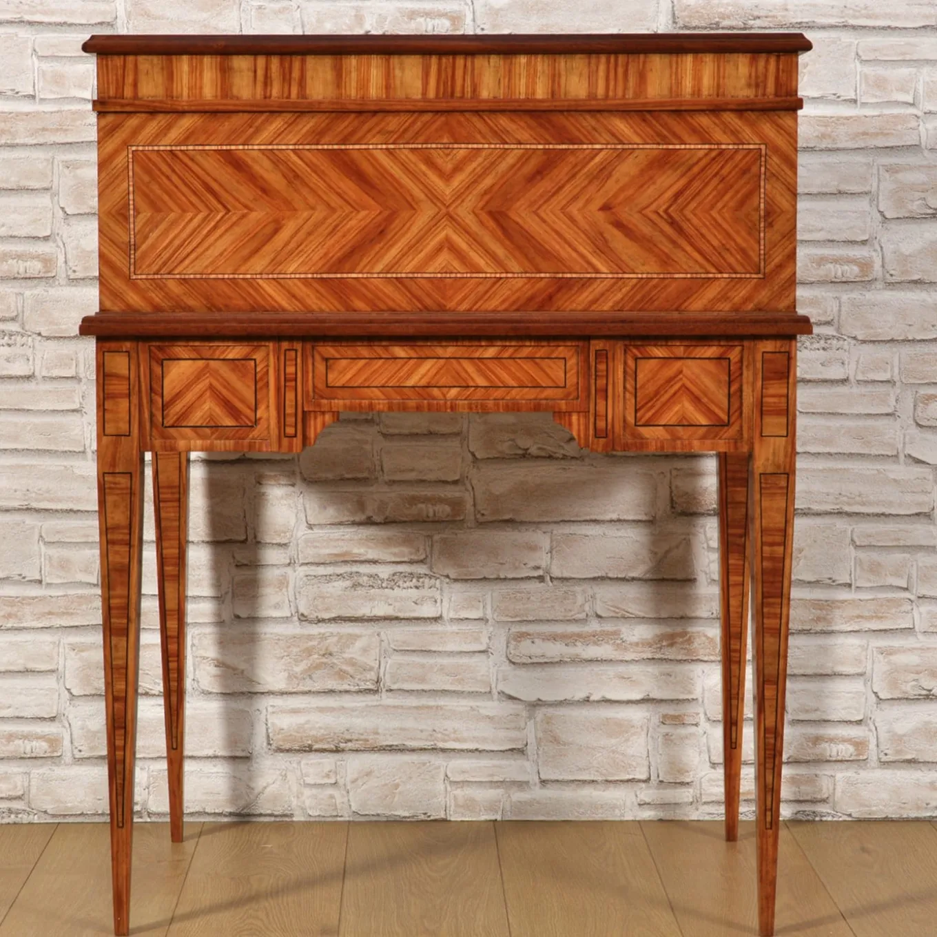 Prestigioso scrittoio dal design a cilindro con intarsi ispirati allo stile neoclassico italiano. Il pezzo presenta elaborati intarsi in rare impiallacciature esotiche come palissandro, acero, ebano, palissandro brasiliano, legno di limone e padouk. Offre un pratico spazio di archiviazione con cassetti multipli accentati da maniglie in ottone e fori per le chiavi. Le sottili gambe affusolate e le proporzioni raffinate rendono questa scrivania un’aggiunta distinta a qualsiasi interno elegante.