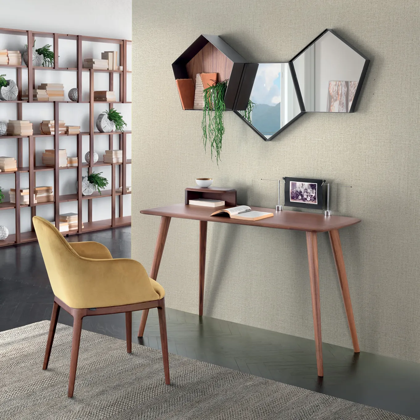 Silhouette allungate e slanciate contraddistinguono questa elegante scrivania adatta ad arredamenti moderni, di metà secolo e rustici. Disegnata da Piergiorgio Mikula, la scrivania è interamente realizzata in massello di noce canaletto, sapientemente modellato nel sottile piano rettangolare con bordi curvi e nelle gambe affusolate che sostengono il pezzo. Il design include un elemento decorativo aggiuntivo, che può essere disposto liberamente per adattarsi a qualsiasi esigenza o gusto di arredamento.