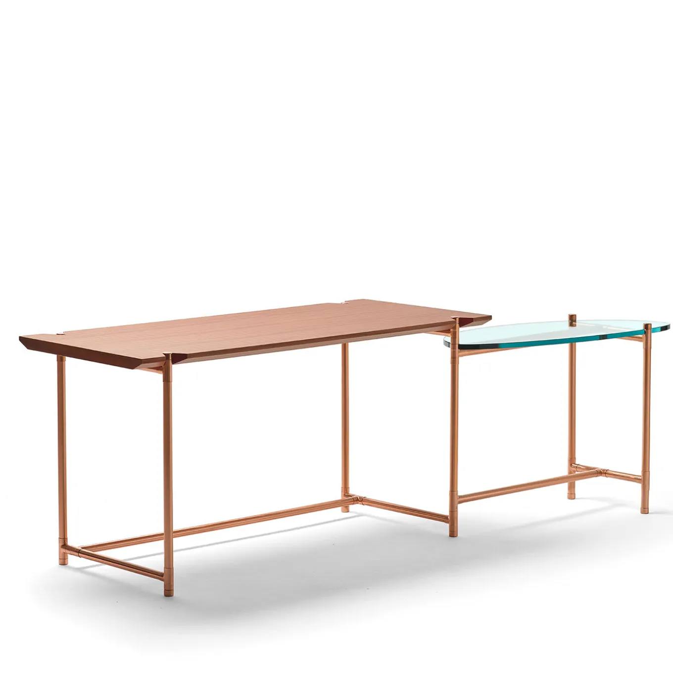 Questa elegante scrivania, che combina materiali leggeri e pregiati, è in grado di valorizzare qualsiasi ufficio o studio moderno con una raffinatezza discreta. La struttura interna in acciaio con tubi di rame esterni sostiene un piano rettangolare in pannelli di fibra a media densità rivestiti in rovere, mantenuto in posizione con l’aiuto di quattro intagli rifiniti in rosso. Lo stesso sistema funge da supporto per l’ulteriore superficie girevole in vetro float di 1,5 cm di spessore, dalla silhouette ellissoidale.