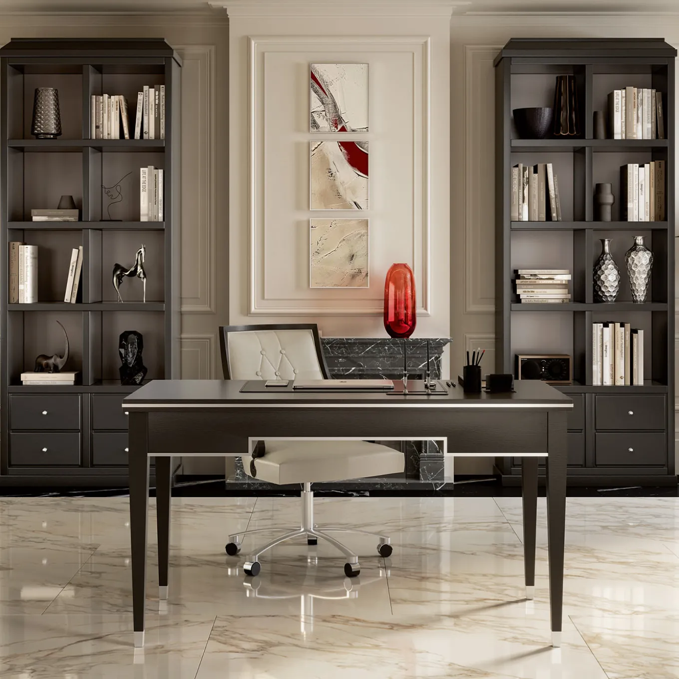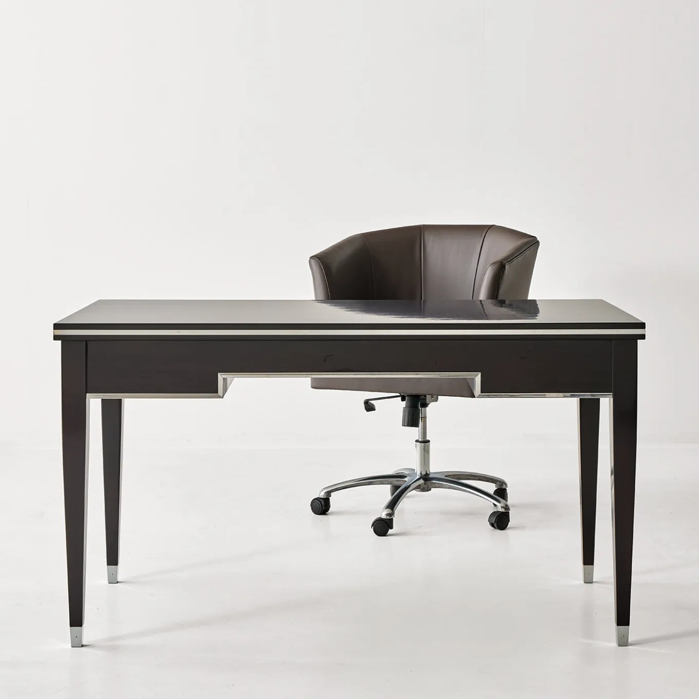 Scrivania di dimensioni medie con tre cassetti per un ampio spazio di archiviazione. Le superfici in legno presentano una finitura raffinata, completata da profili in cromo lucido, maniglie e cappucci delle gambe. Le gambe sottili e affusolate esaltano la sua silhouette elegante e contemporanea, perfetta per ambienti domestici e per ufficio.