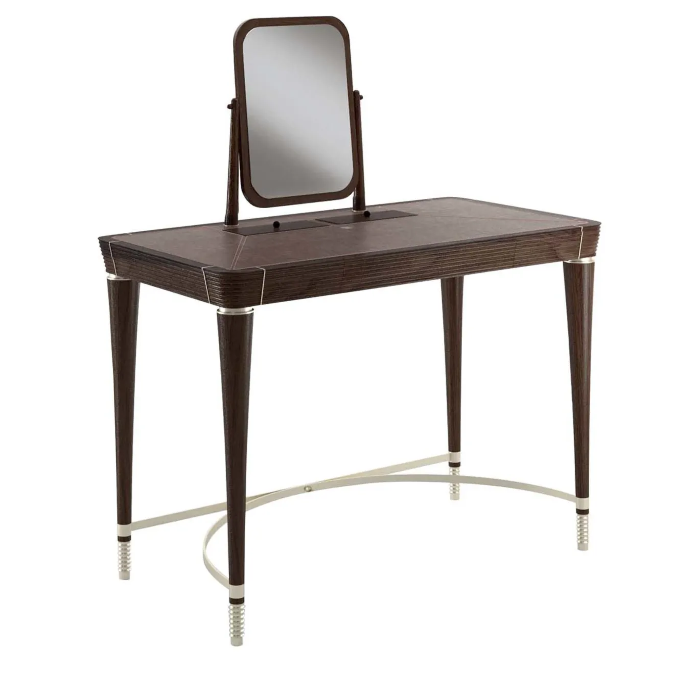 L’elegante base di questo scrittoio è caratterizzata da una forma geometrica con due listelli in metallo bronzato: uno semicircolare collegato alle gambe anteriori e uno dritto che unisce le gambe posteriori. L’elegante struttura in legno poggia su quattro gambe coniche con ferule bronzate e presenta un piano con bordi curvi e un unico cassetto frontale nascosto nell’ampio bordo, decorato con intagli orizzontali. Accessoriato con uno specchio rettangolare girevole e due vani portaoggetti con coperchio, questo perfetto accessorio per la toilette può fungere anche da scrittoio, adattandosi perfettamente a decori tradizionali e moderni.