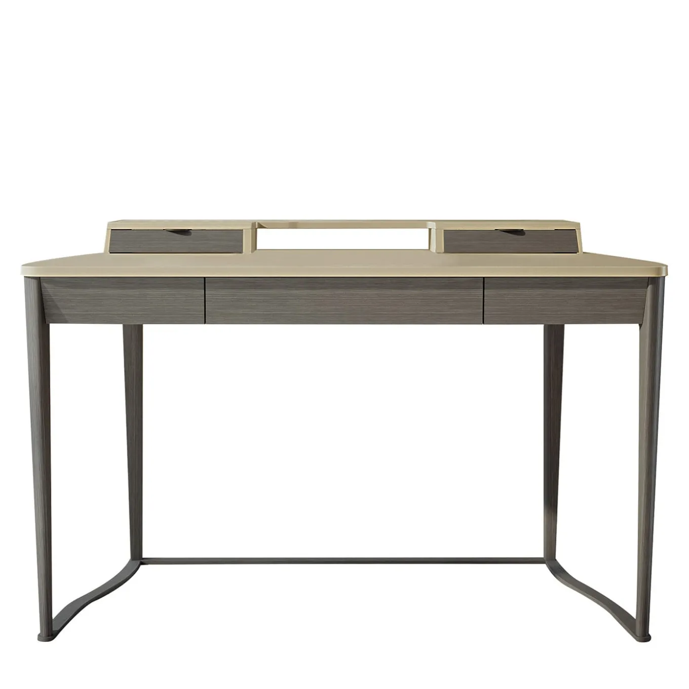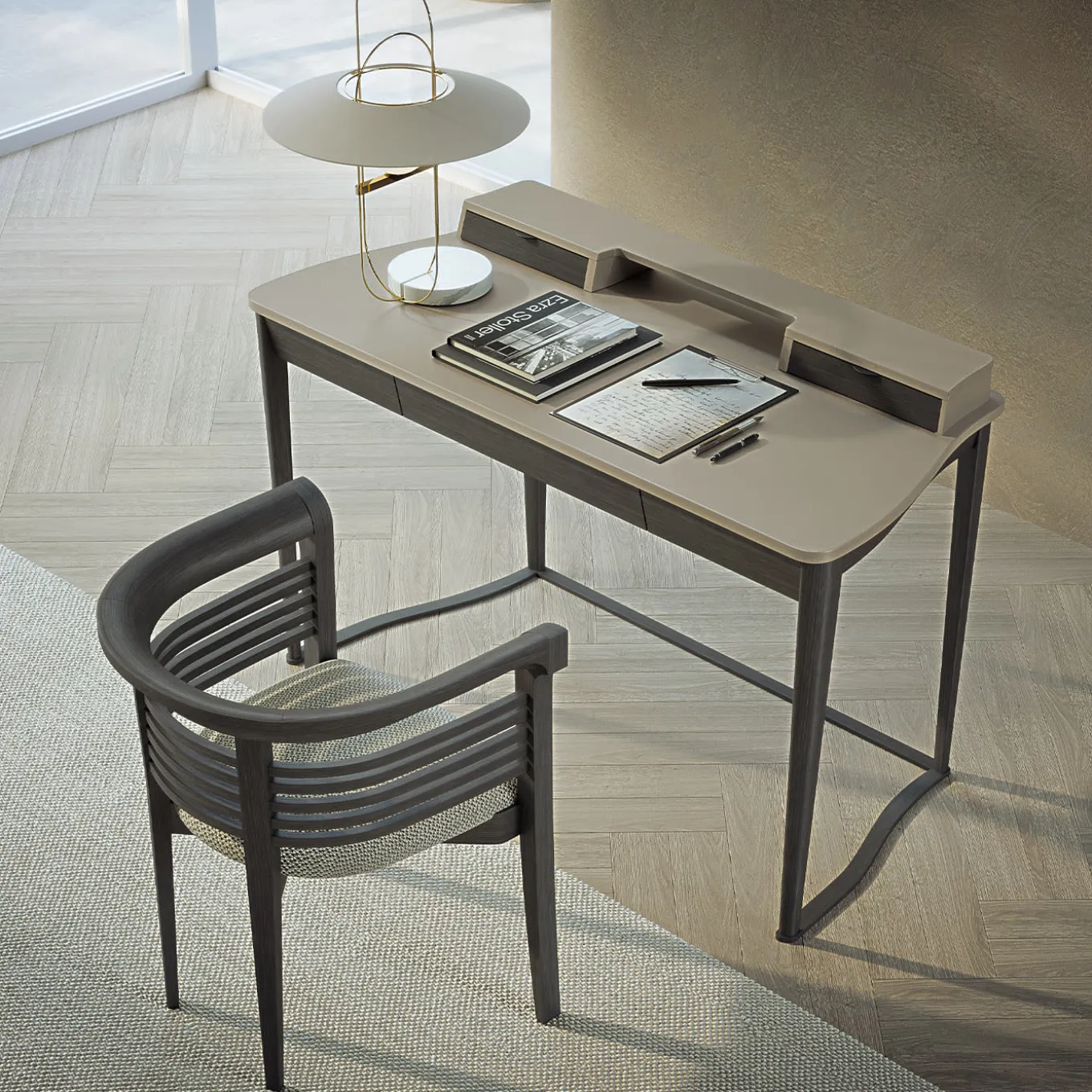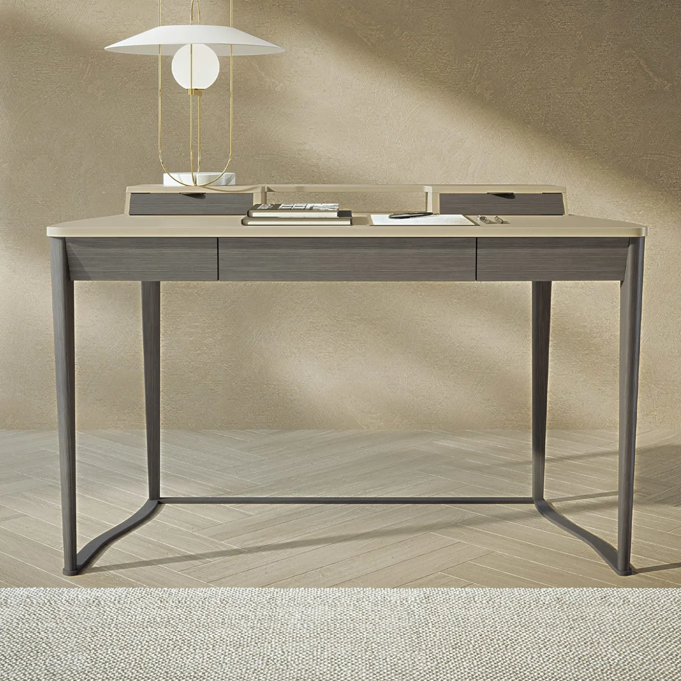 Scrivania con un ampio cassetto push-to-open e cassetti superiori più piccoli con eleganti maniglie in metallo. Le gambe sono realizzate in legno massello con una finitura Tay scura, mentre il piano è rivestito in pelle, disponibile in una gamma di colori. Disponibile anche in una finitura in noce Canaletto.