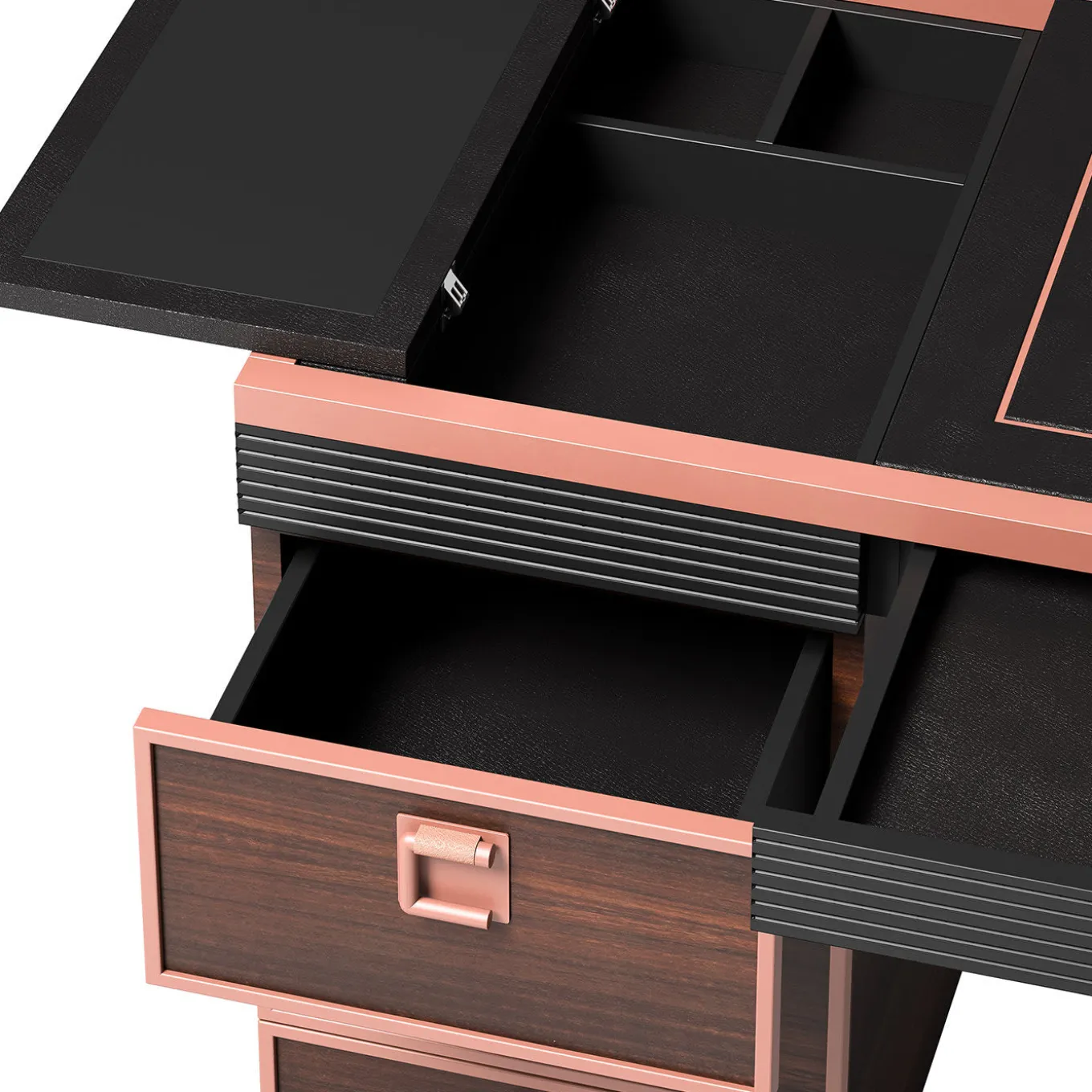 L’estetica minimale e il design funzionale di questa raffinata scrivania la rendono perfetta per un soggiorno moderno o per l’arredamento dell’ufficio. Sostenuta da una struttura con impiallacciatura in eucalipto e dettagli in metallo con finitura in rame, questa scrivania ha un piano in pelle nera con bordo a cascata e una gamba a telaio aperto da un lato e un bordo affilato e un’unità a tre cassetti dall’altro. Questa scrivania è ricca di dettagli funzionali: da un cassetto aggiuntivo con chiusura ammortizzata per il computer portatile a un vano portaoggetti nascosto sul piano laterale. I cassetti sono dotati di pomelli in metallo con finitura rame spazzolato e logo dell’azienda.