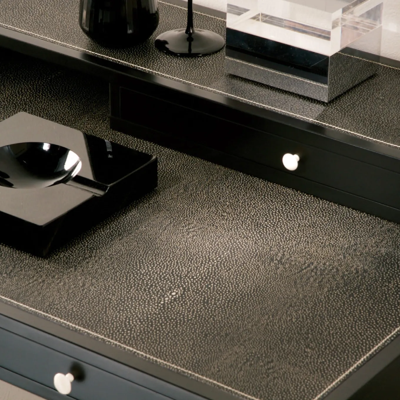 Versione femminile del Victor Desk, questo elegante design si ispira al glamour degli anni ’40. Ideale come “bureau de dame”, questo pezzo di stile può fungere da piano d’appoggio e di lavoro in un ufficio, accanto a un divano in salotto o in camera da letto come tavolino da toilette, abbinato a un comodo pouf. La sua pregiata struttura in ebano Macassar è dotata di cinque pratici cassetti con accenti metallici dipinti in avorio, nelle punte delle gambe e nelle maniglie dei cassetti.