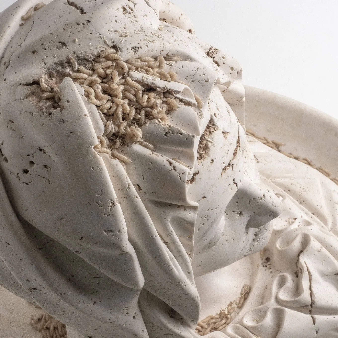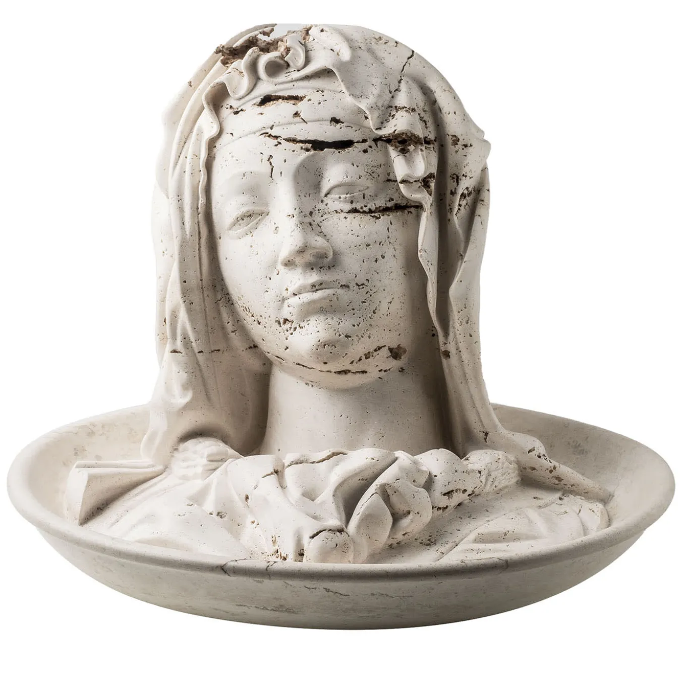 La testa della Vergine Maria del capolavoro La Pietà di Michelangelo è magistralmente ricreata in questa scultura contemporanea attraverso una minuziosa lavorazione manuale del pregiato marmo Travertino, caratterizzato da singolari buchi e crepe. Proprio seguendo le imperfezioni naturali della pietra, l’artista Matteo Peducci sottolinea il concetto di inesorabile decadimento.