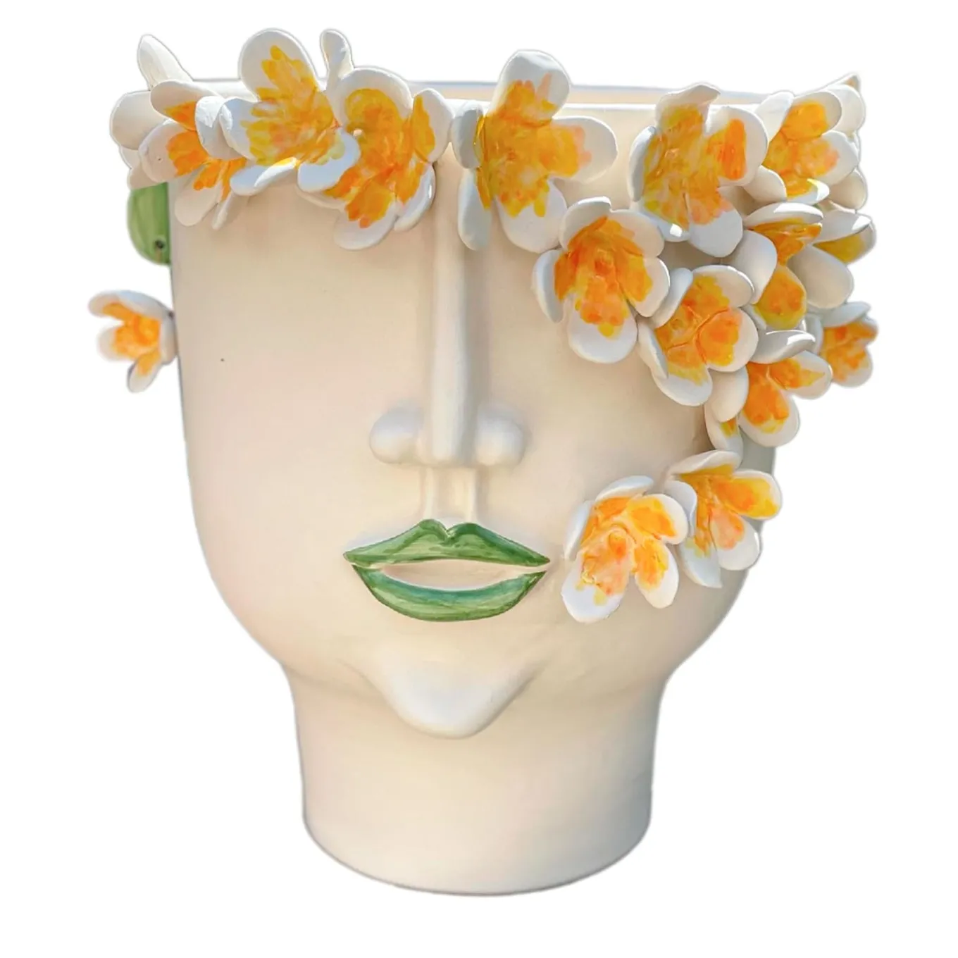 Straordinariamente lavorata e decorata a mano secondo l’antica tradizione siciliana della lavorazione delle teste di moro, questa splendida scultura in ceramica può essere utilizzata sia come vaso da fiori che come oggetto d’arte decorativo in ambienti interni ed esterni. Arricchita da eleganti applicazioni di fiori di plumeria, è smaltata con una tonalità bianco crema e dettagli verdi e arancioni.