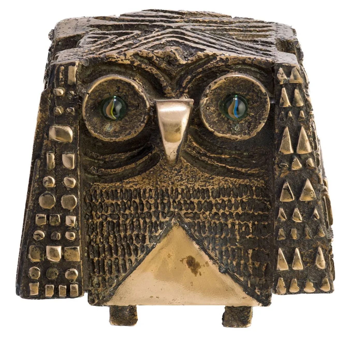 La civetta, animale portafortuna, è senza dubbio il soggetto più ricorrente nella produzione di Gianmaria Potenza. La capacità di questo animale di vedere nell’oscurità, quindi sinonimo di saggezza e conoscenza inconscia, rappresenta la dualità dell’occhio dell’artista, poiché la comprensione intrinseca del creatore d’arte non consiste solo nel portare luce all’oscurità, ma anche vita all’oscurità stessa. Le sue dimensioni e gli inserti in marmo di vetro per gli occhi conferiscono loro uno sguardo vivace.