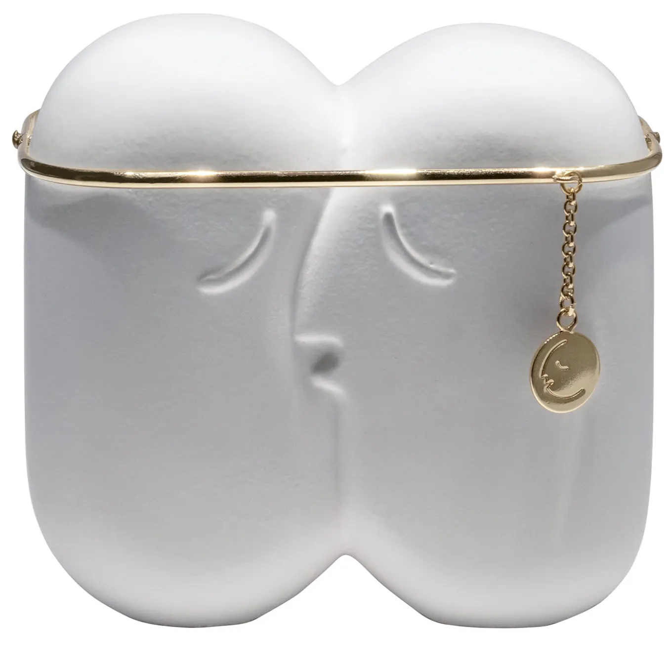 Il bacio, una delle immagini più celebri dell’arte e del design, diventa nelle mani di Antonio Aricò un oggetto poetico ed elegante. Lo smalto lucido della ceramica bianca e l’anello placcato oro che tiene simbolicamente unite le teste evocano un senso di purezza eterea e di amore assoluto. Il ciondolo con il logo del marchio completa questo pezzo esclusivo che è un affascinante regalo di nozze e un dono significativo per una persona speciale.