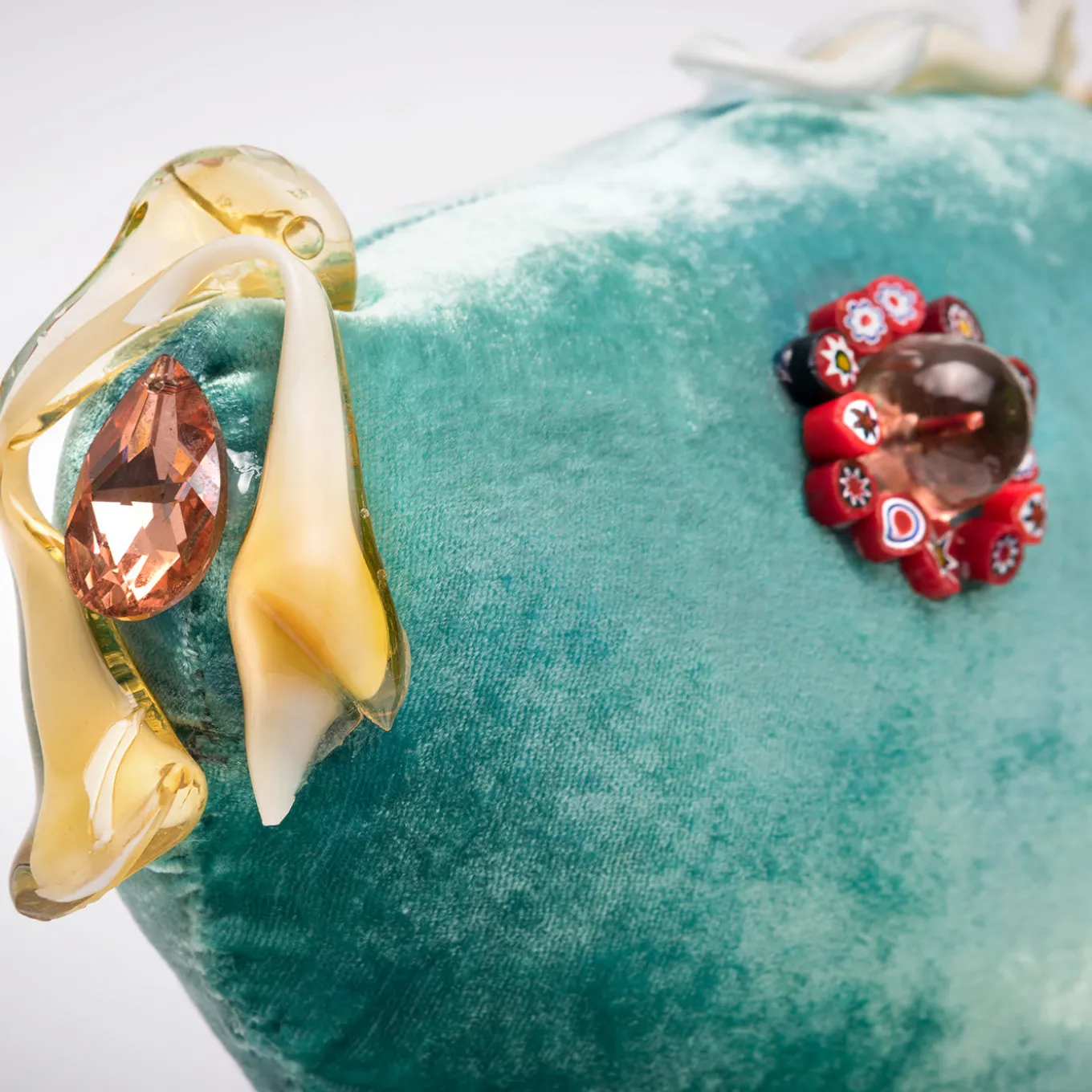 Questa scultura unica dell’artista tessile Anna Paola Cibin unisce la tradizione a uno stile originale. È realizzata in velluto di seta dipinto a mano con pigmenti azzurro e verde chiaro, le cui delicate sfumature cromatiche sono esaltate dalla superficie scintillante del lussuoso tessuto. Il disegno vorticoso che impreziosisce il corpo e l’occhio del pesce è realizzato con perle di vetro di Murano soffiate a mano. Aggiunta sofisticata a un arredamento eclettico e contemporaneo, questa scultura è presentata da una base minimale in acciaio verniciato di verde.