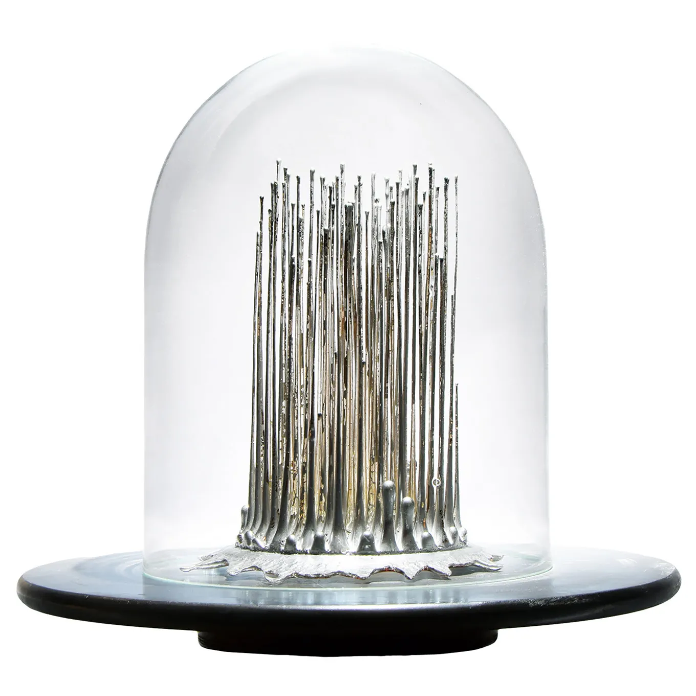 Rivelati attraverso una campana di vetro soffiato trasparente, i filamenti argentati del vetro di Murano fusi in un unico passaggio rappresentano uno scenario scintillante e ghiacciato, da cui il nome del pezzo che significa “era glaciale”. Il design si ispira alle utopiche “Città invisibili” di Italo Calvino e al loro fascino etereo. Riproducibile in una forma simile ma mai identica, la scultura poggia su un supporto girevole in legno rivestito con una resina microcementizia e strutturata, impreziosita da una finitura argentata.