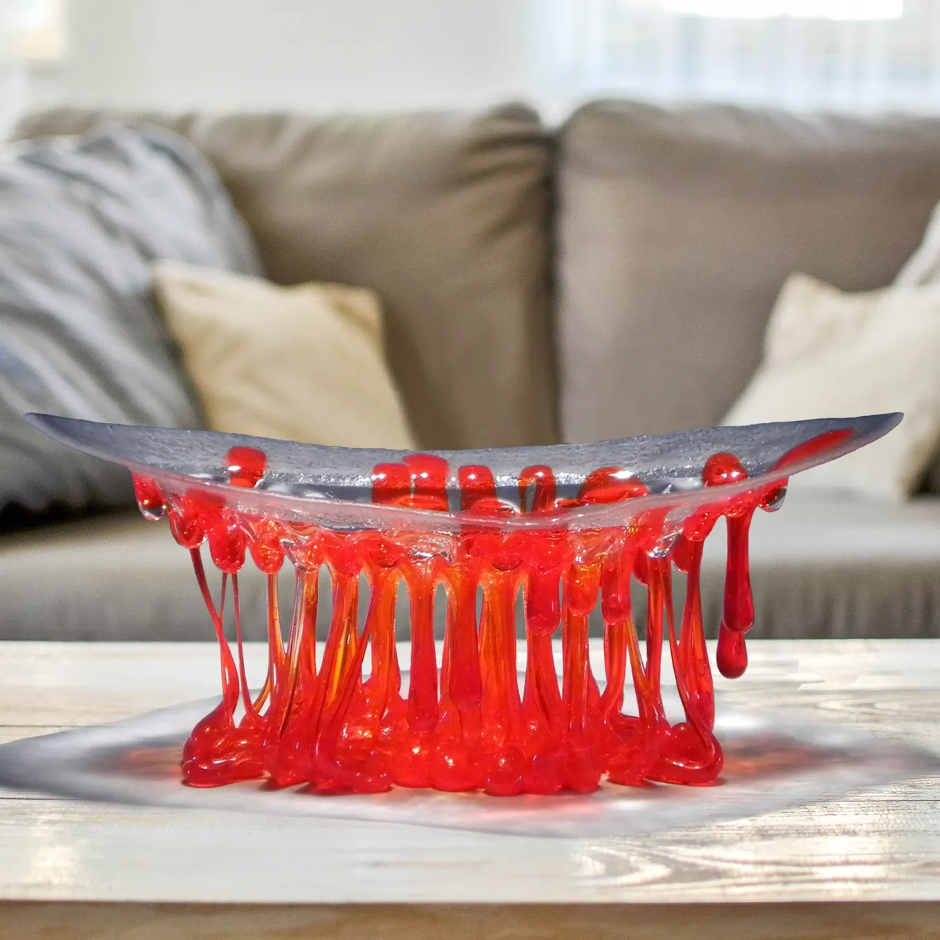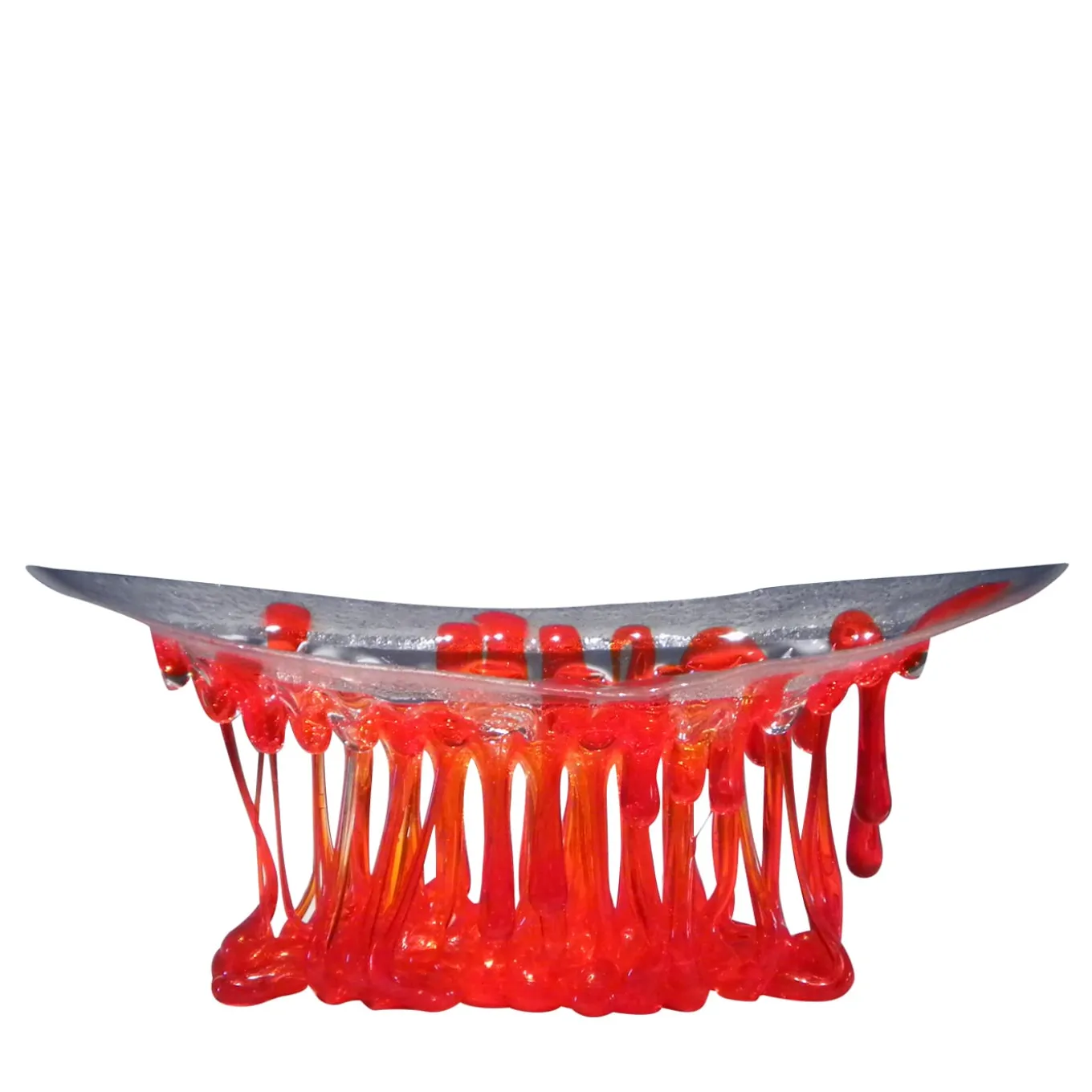 Questa splendida scultura in vetro di Murano è un pezzo splendido che può essere esposto in qualsiasi casa o ufficio con un arredamento moderno. La parte superiore in vetro trasparente di questo pezzo ricorda una barca, con la struttura curva sostenuta da forme rosse brillanti che sembrano quasi meduse gocciolanti sotto di essa.