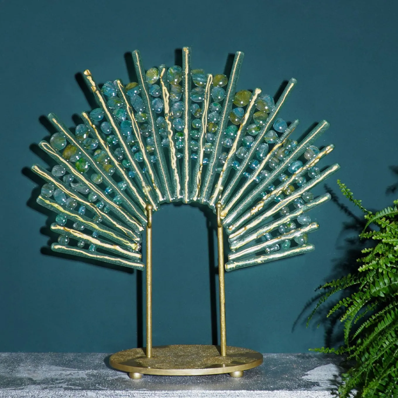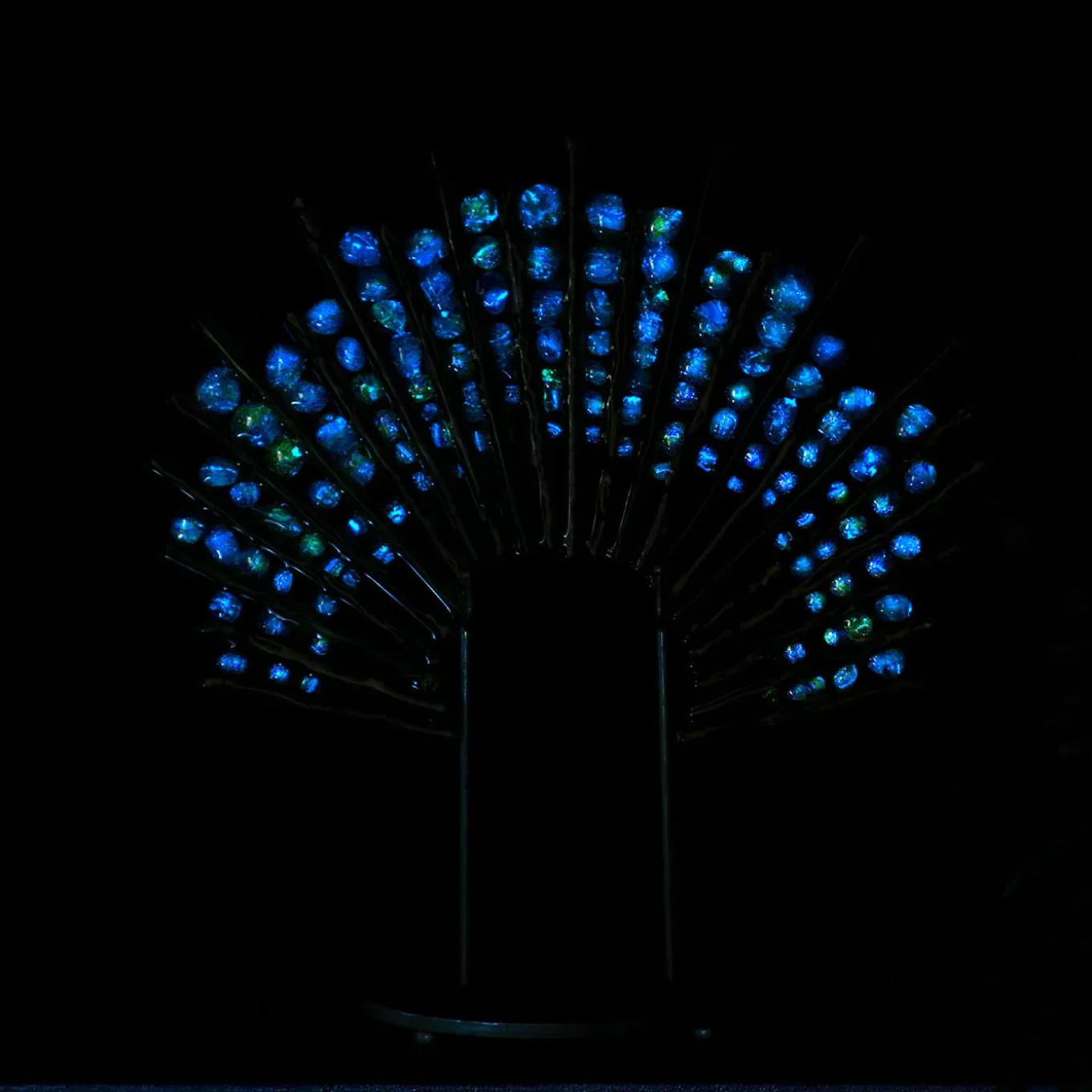 La scultura in vetro Pavone è caratterizzata da strisce di vetro disposte a raggiera, ognuna delle quali sostiene pezzi di vetro traslucido verde e blu simili a gemme, decorati con polvere di mica dorata ed elementi di fusione fluorescenti. Le strisce si estendono verso l’esterno e verso l’alto, formando una forma semicircolare che ricorda la coda di un pavone. Montato su una base di metallo dorato, la combinazione di colori vivaci e il bagliore fluorescente accentuano i dettagli più complessi. Possono verificarsi lievi variazioni dovute alla lavorazione a mano.