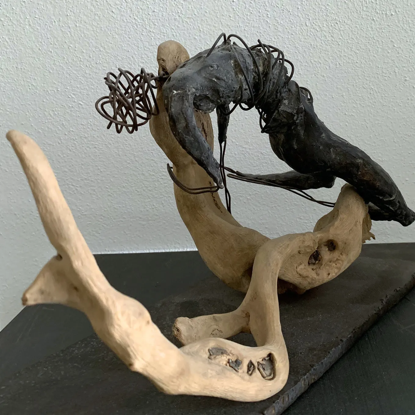 Magnifico pezzo di raffinata allure, questa scultura fonde sentimenti di solitudine, libertà e pace in un corpo femminile che riposa. Squisitamente realizzata in bronzo con l’antico metodo della cera persa, la figura distesa è avvolta da un filo di rame intorno alla vita, alle mani e alla testa, che esalta le parti più significative del corpo. La figura è appoggiata su un pezzo di legno, raccolto su una spiaggia toscana dopo una tempesta costiera, saldamente montato su una sottile base di ferro.
