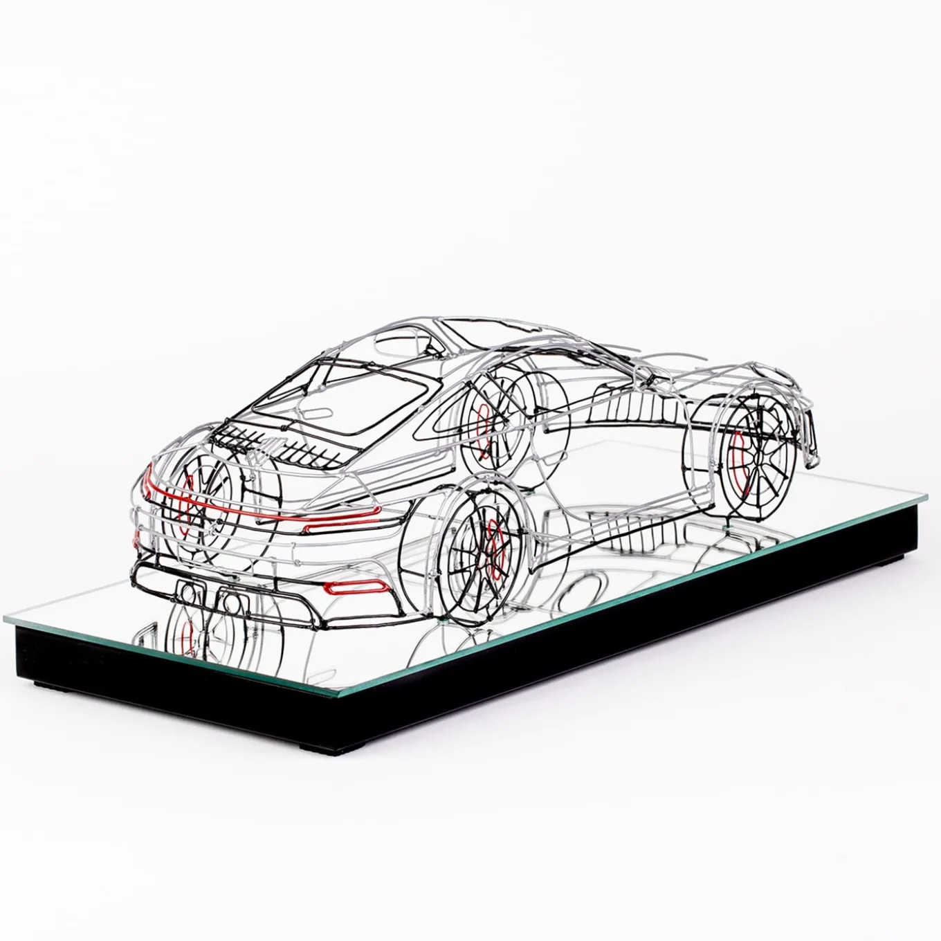 Stupenda dimostrazione di maestria artigianale, questa statuetta è un’opera d’arte unica di stile contemporaneo. Realizzata a mano in filo di metallo argentato combinato con dettagli colorati in filo di ferro nero, raffigura un’auto Porsche appoggiata su una base nera lucida con un piano a specchio, che aggiunge eleganza a questo design singolare. Il modello dell’auto è personalizzabile, si prega di consultare il Concierge per i dettagli.