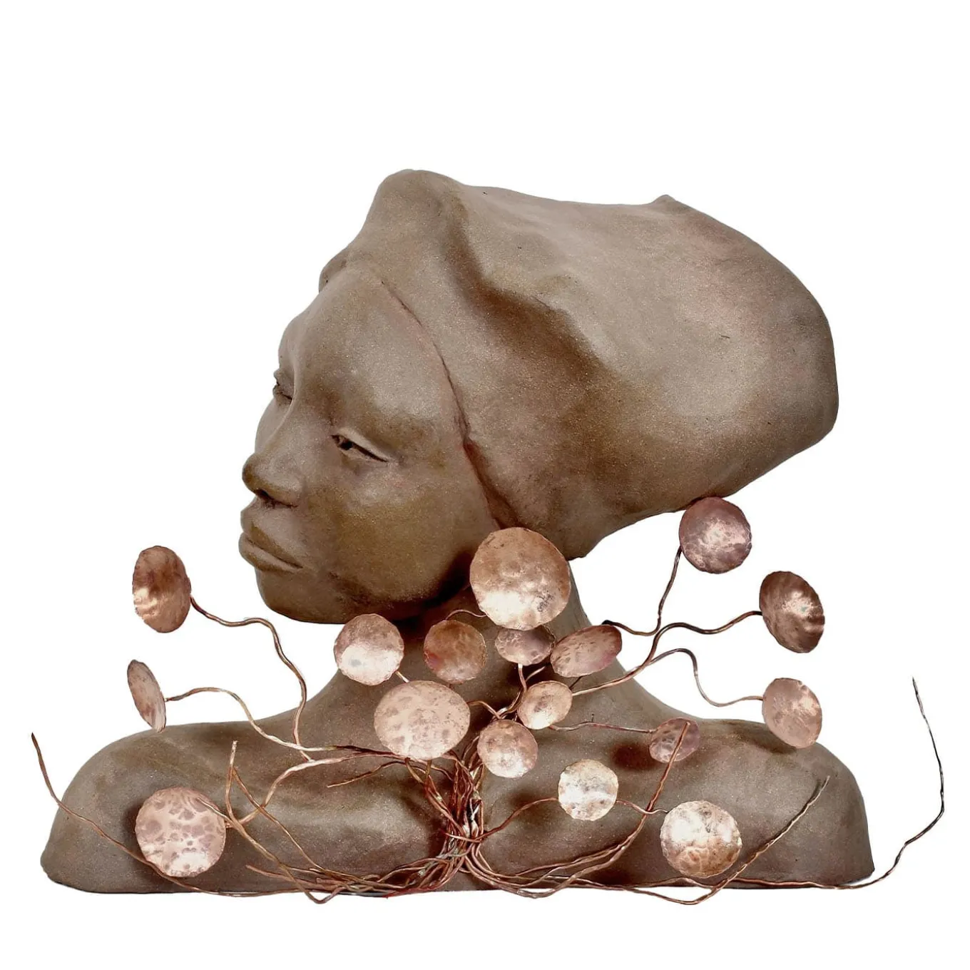 Questa scultura in ceramica, ispirata all’albero Thuja noto come “albero della vita”, presenta un busto umano contemplativo ornato da delicati elementi in rame che ricordano la crescita organica. Il pezzo combina la consistenza terrosa della ceramica con la sottile lucentezza metallica dei dettagli in rame lavorati a mano, creando una miscela armoniosa di ispirazione naturale ed espressione artistica. È un oggetto decorativo di grande effetto in qualsiasi ambiente sofisticato.