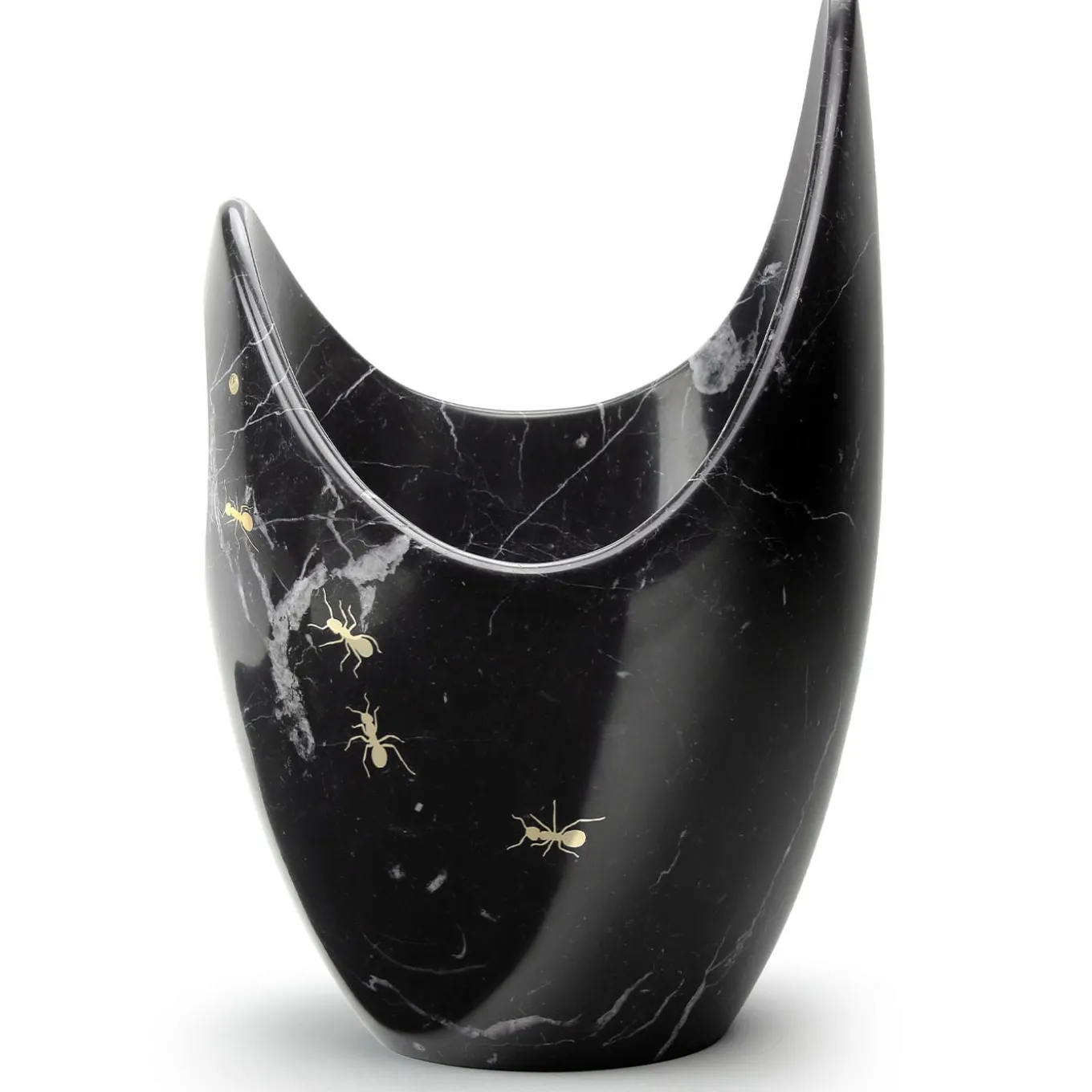 Lussuoso e grande secchiello da champagne scolpito a mano da un blocco massiccio di marmo di Marquinia con formiche in ottone intarsiato. Edizione limitata a 50 esemplari. Ogni secchiello per champagne è firmato e numerato a mano dagli artisti (inciso). Il marmo è un materiale naturale, ogni pezzo è unico in quanto ogni blocco di marmo è diverso per venature e sfumature di colore. Tutte le nostre creazioni sono realizzate a mano da artigiani italiani e possono variare leggermente nella forma e nelle dimensioni.