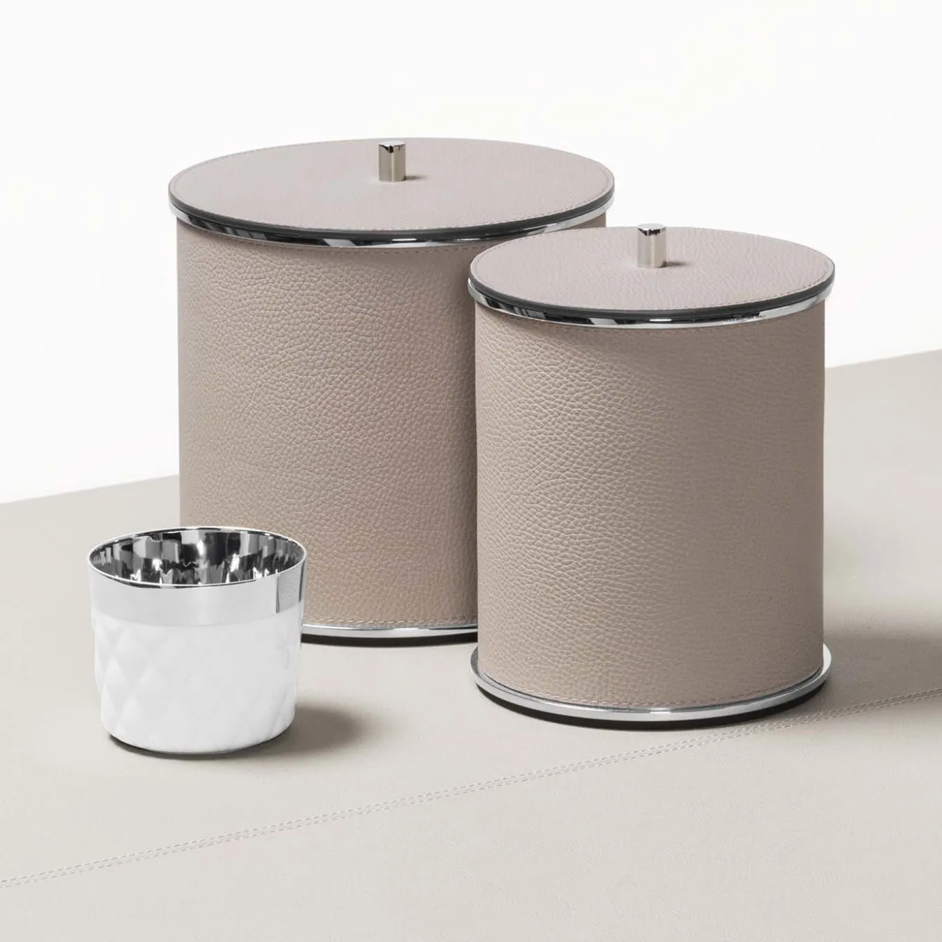 Elegante e raffinato, questo secchiello per il ghiaccio è realizzato con materiali di alta qualità. Rivestito in pregiata pelle bianca, il pezzo presenta una struttura isolante a doppia camera in ottone e acciaio ed è arricchito da un elegante coperchio.