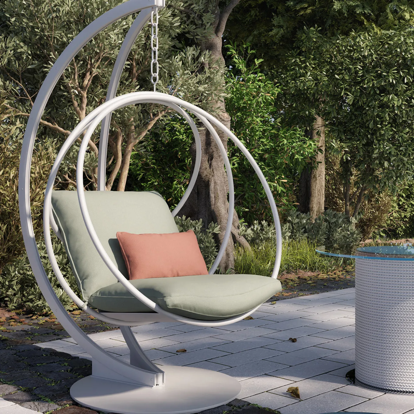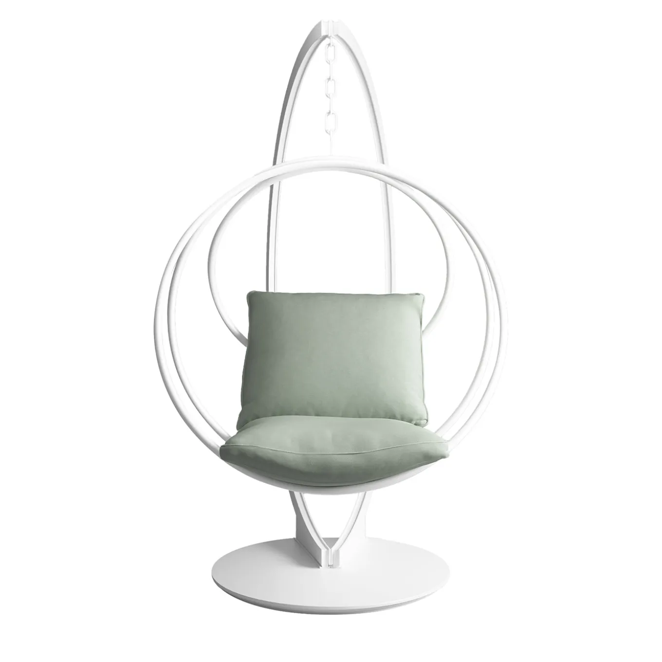 Sedia a dondolo sospesa in acciaio bianco Clara progettata per uso esterno, con struttura in acciaio verniciato a polvere per durata e resistenza alle condizioni atmosferiche. La sedia è sospesa da un supporto arcuato, che consente un delicato movimento di dondolio. Include cuscini morbidi per un maggiore comfort, progettati per migliorare il relax in qualsiasi ambiente esterno. La sua estetica moderna e minimalista unisce uno stile contemporaneo a un design funzionale, rendendola adatta per patio, giardini o terrazze. Cuscini inclusi e disponibili in una gamma di tessuti e colori su richiesta, contattare il Concierge per ulteriori informazioni.