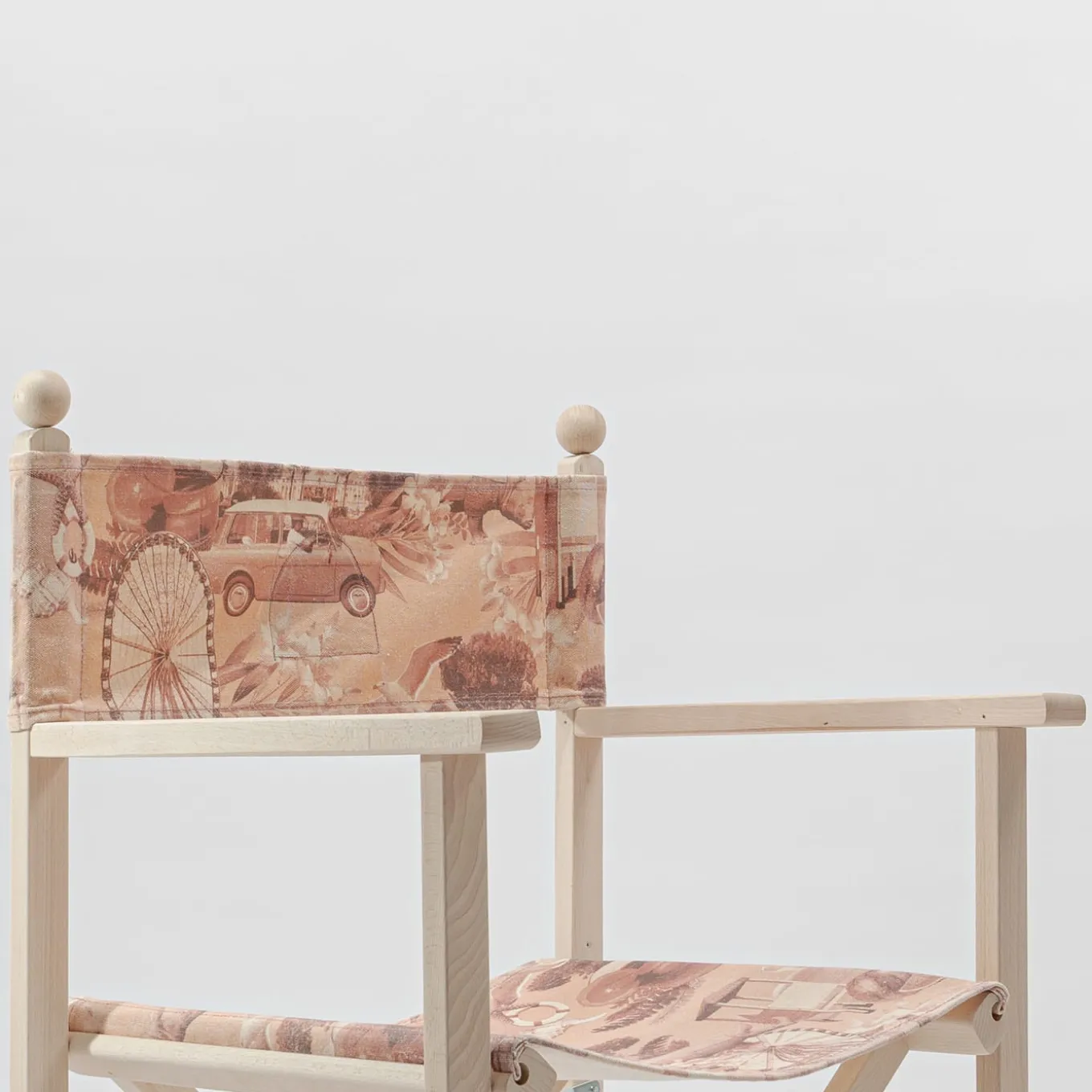 Sedia da regista pieghevole in faggio massiccio caratterizzata dall’inserimento di fregi e modanature in legno tornito. Tessuto in cotone stampato con grafica Rimini comprensivo di cuciture e asole per l’inserimento delle bacchette di fissaggio in legno.
