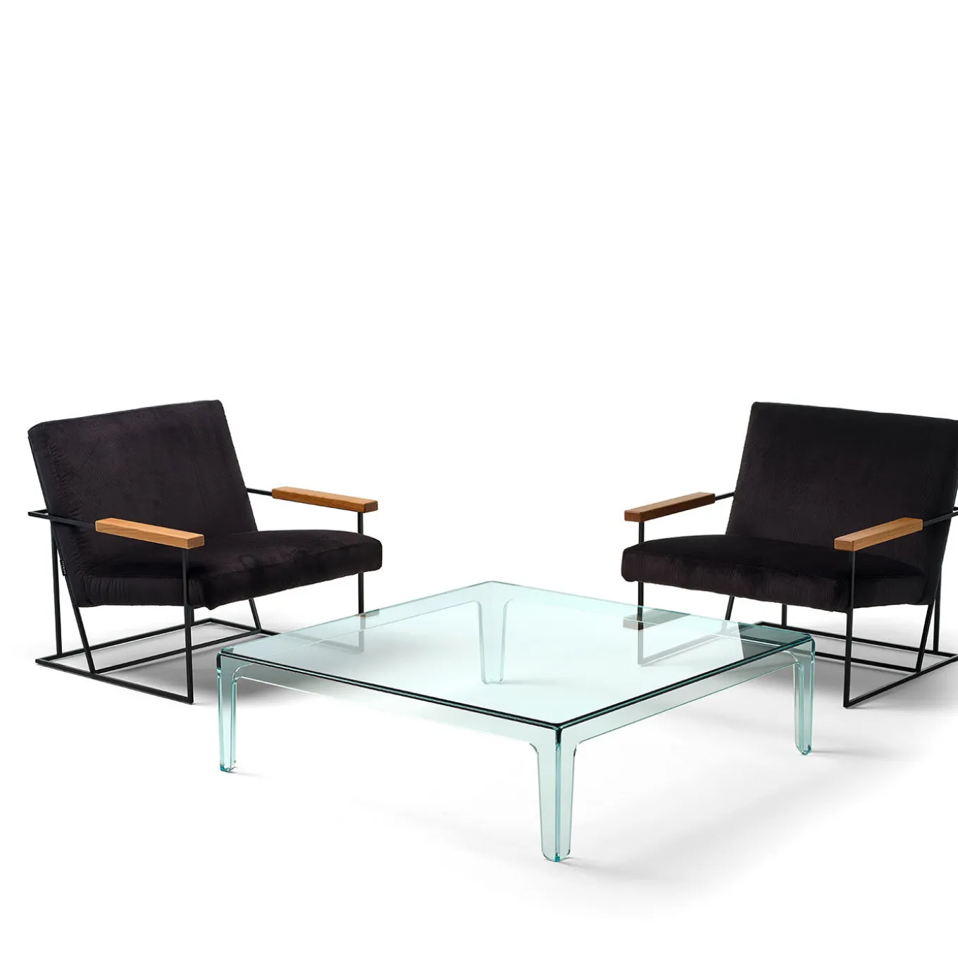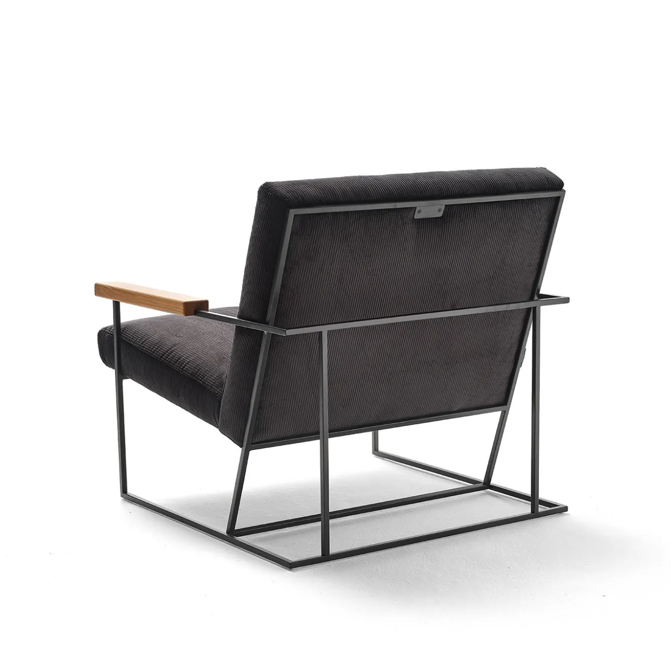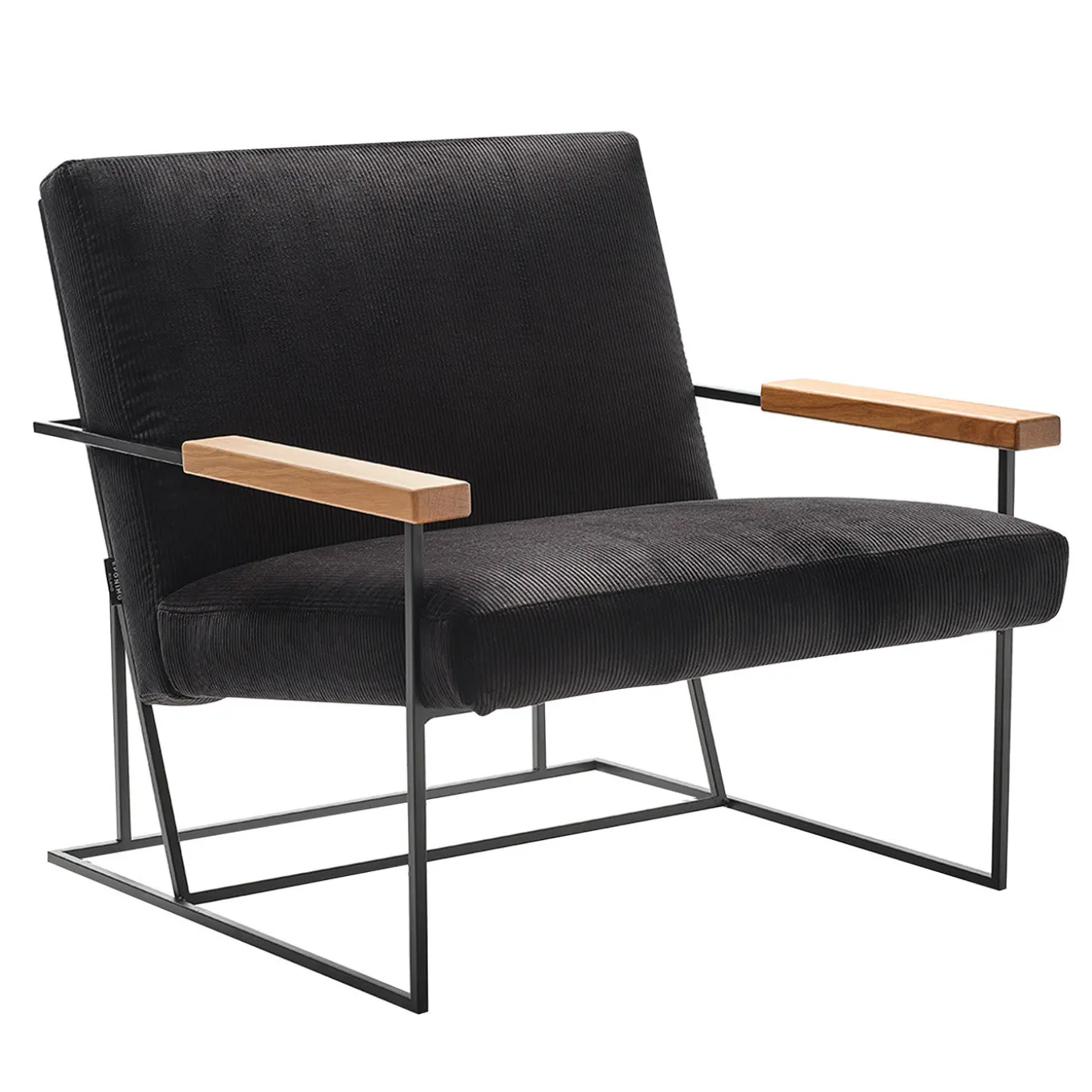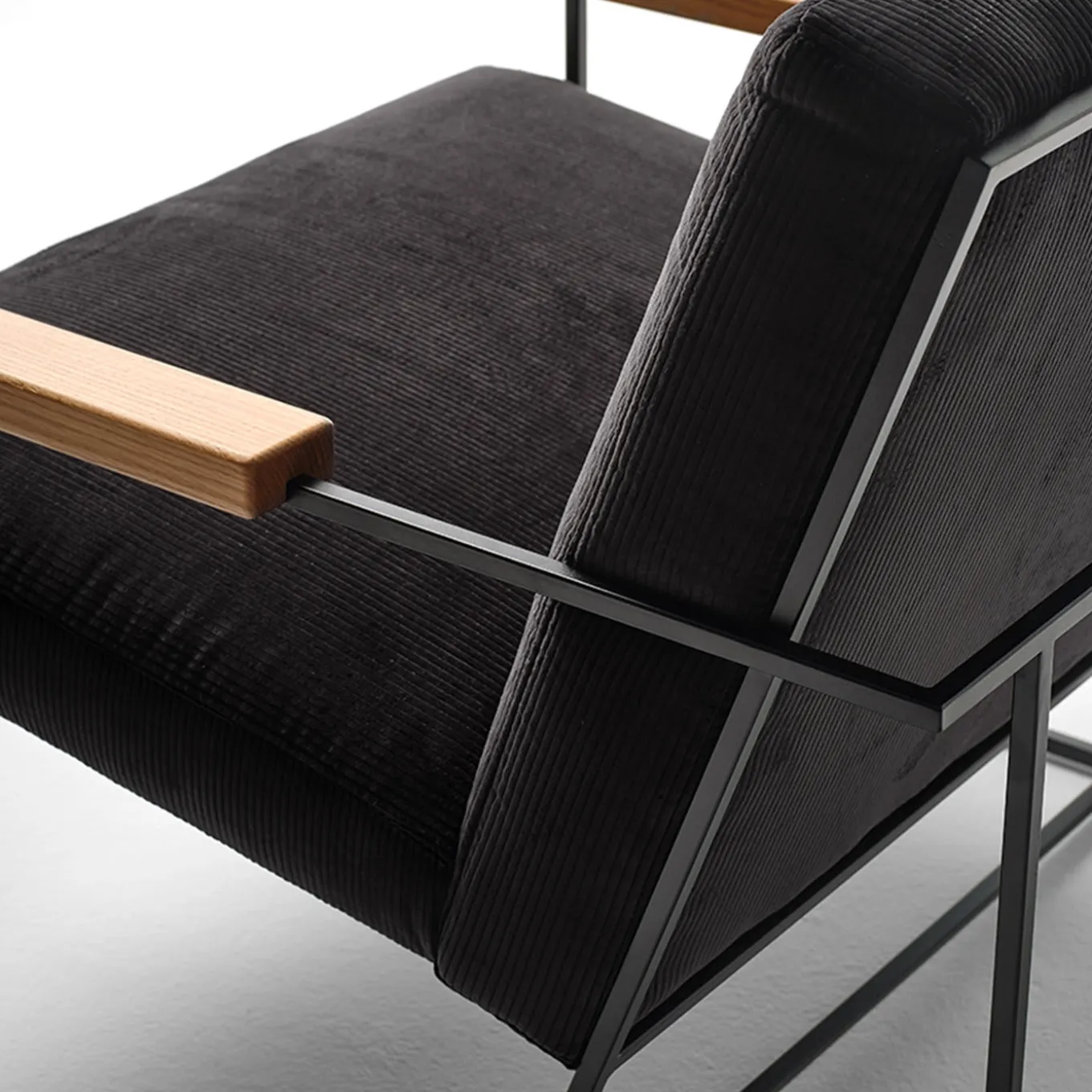 Solidi e vuoti perfettamente bilanciati definiscono magistralmente l’estetica elegante di questa poltrona lounge. Sollevata su una base sottile e aggraziata in acciaio laccato nero, l’ampia e accogliente seduta è affiancata da due eleganti braccioli in rovere massiccio che si estendono fino ad abbracciare lo schienale. La generosa imbottitura in poliuretano espanso è racchiusa nel rivestimento in cotone nero a coste, che completa il design. Chiedete al Concierge le opzioni di personalizzazione disponibili.