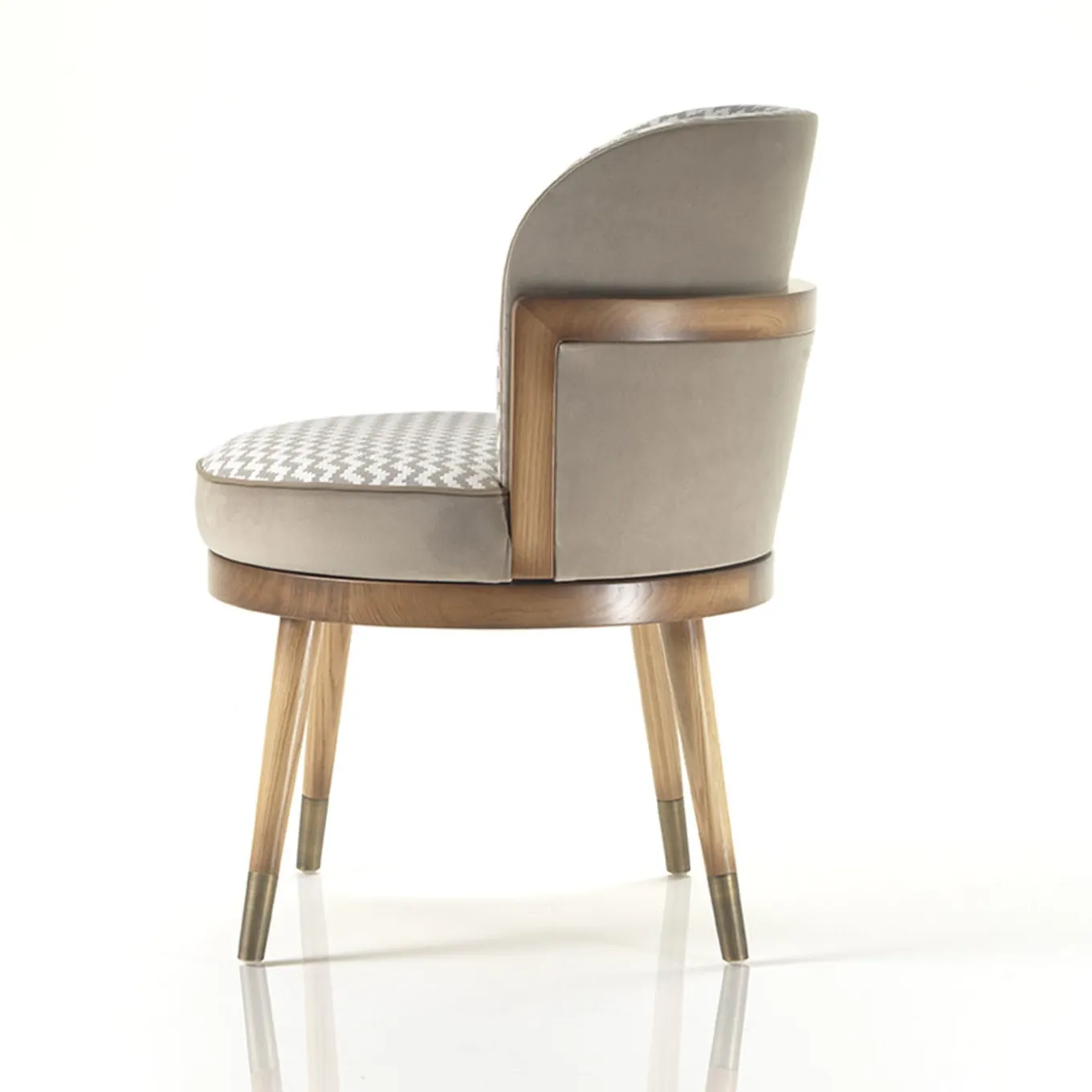 Inconfondibilmente contemporanea, questa sedia con finitura in noce fa un uso sofisticato di profili e motivi geometrici. Accentuate da punte di metallo, le gambe affusolate sostengono efficacemente la seduta, mentre la scocca avvolgente è realizzata per offrire il giusto sostegno durante la seduta. Il comfort duraturo è garantito da una ricca imbottitura rivestita da una combinazione di tessuto tinta unita color tortora e tessuto con motivi a zig-zag per un tocco di stile vivace e accattivante.