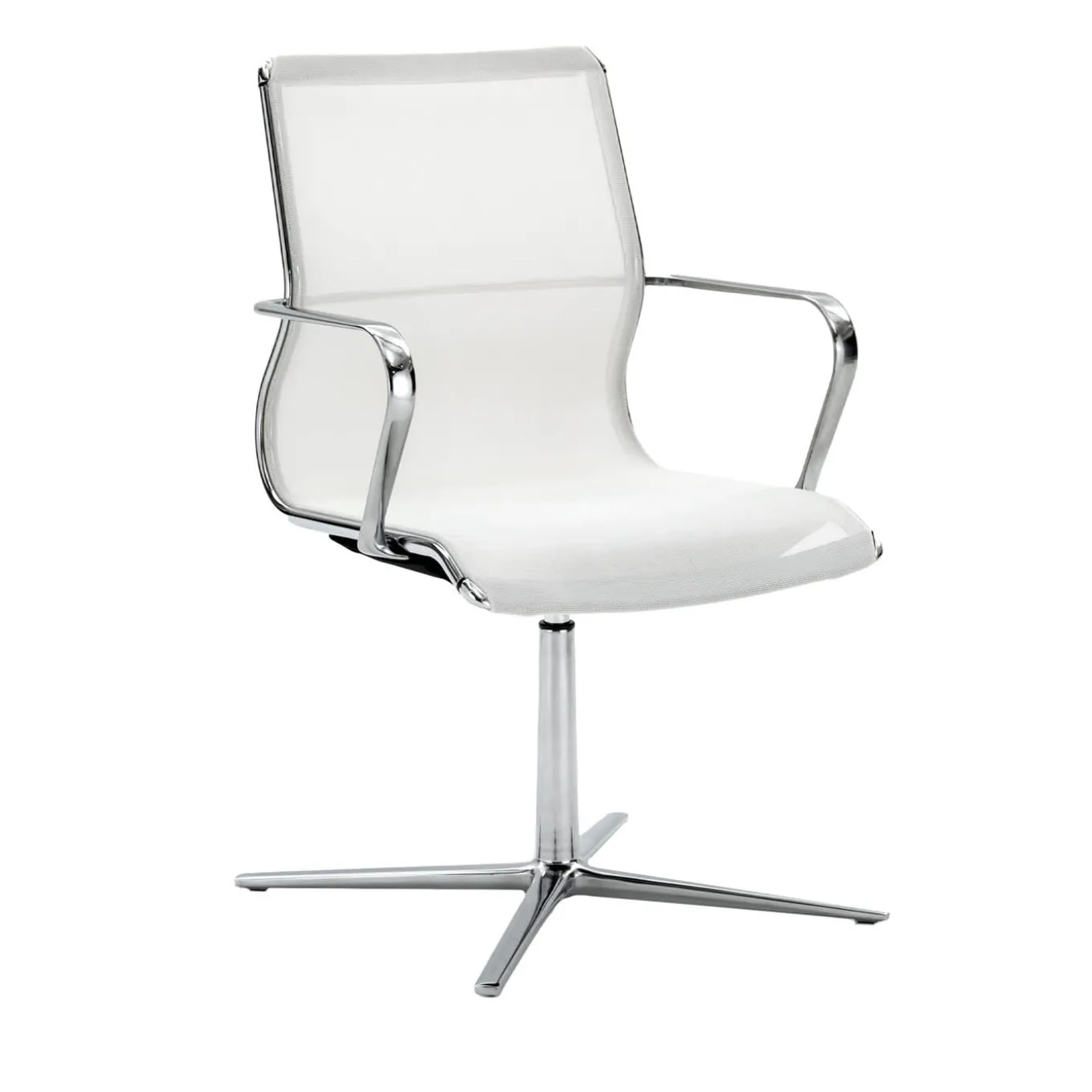 Omega è una famiglia di sedie dalle forme lineari e dalla texture particolare, caratterizzata dal susseguirsi delle linee, in uno stile moderno ed elegante nella seduta termoformata, o in una versione più leggera in rete. La seduta Omega aggiunge un arredamento sofisticato a ogni ufficio. Poltrona da riunione in rete ignifuga, girevole, altezza fissa, braccioli fissi in alluminio lucido, base piatta a 4 razze in alluminio lucido, rivestimento in rete colore bianco.