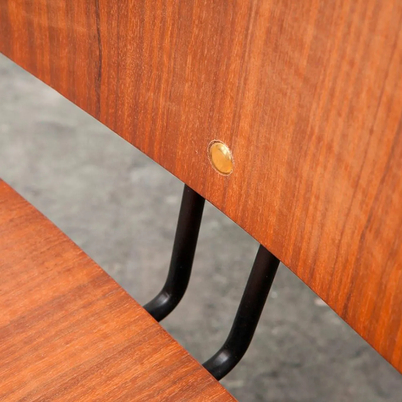 Parte della “Collezione ABV”, questa sedia, disegnata nel 1957, esemplifica la predilezione di Osvaldo Borsani per i progetti puliti con un dettaglio segreto che li rende eccezionali. Il sedile in legno dalla forma morbida è sostenuto da una base a treppiede in cui ogni gamba è composta da due sottili tubi d’acciaio, la stessa struttura verniciata di nero che si ripete come supporto per lo schienale. Facile da smontare e da ripiegare, questa sedia è stata dirompente al momento del suo debutto e lo è tuttora, poiché offre una seduta intelligente con il minimo sforzo.