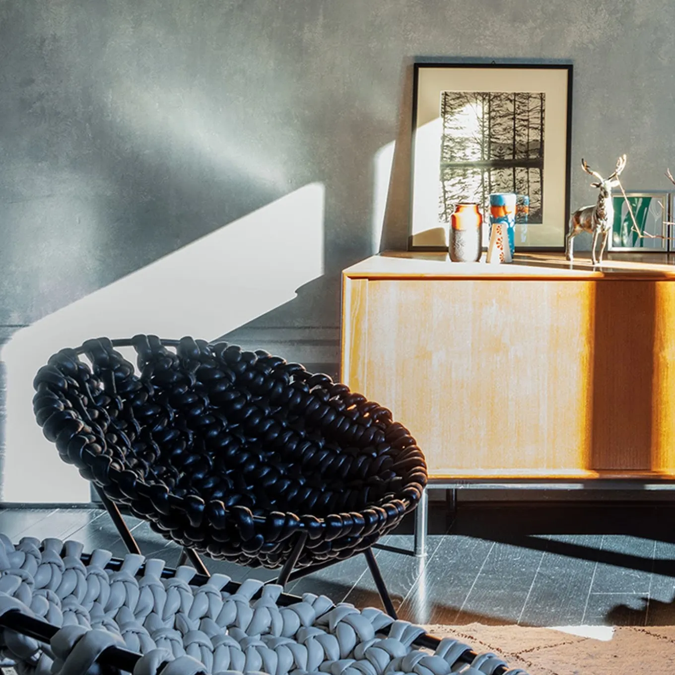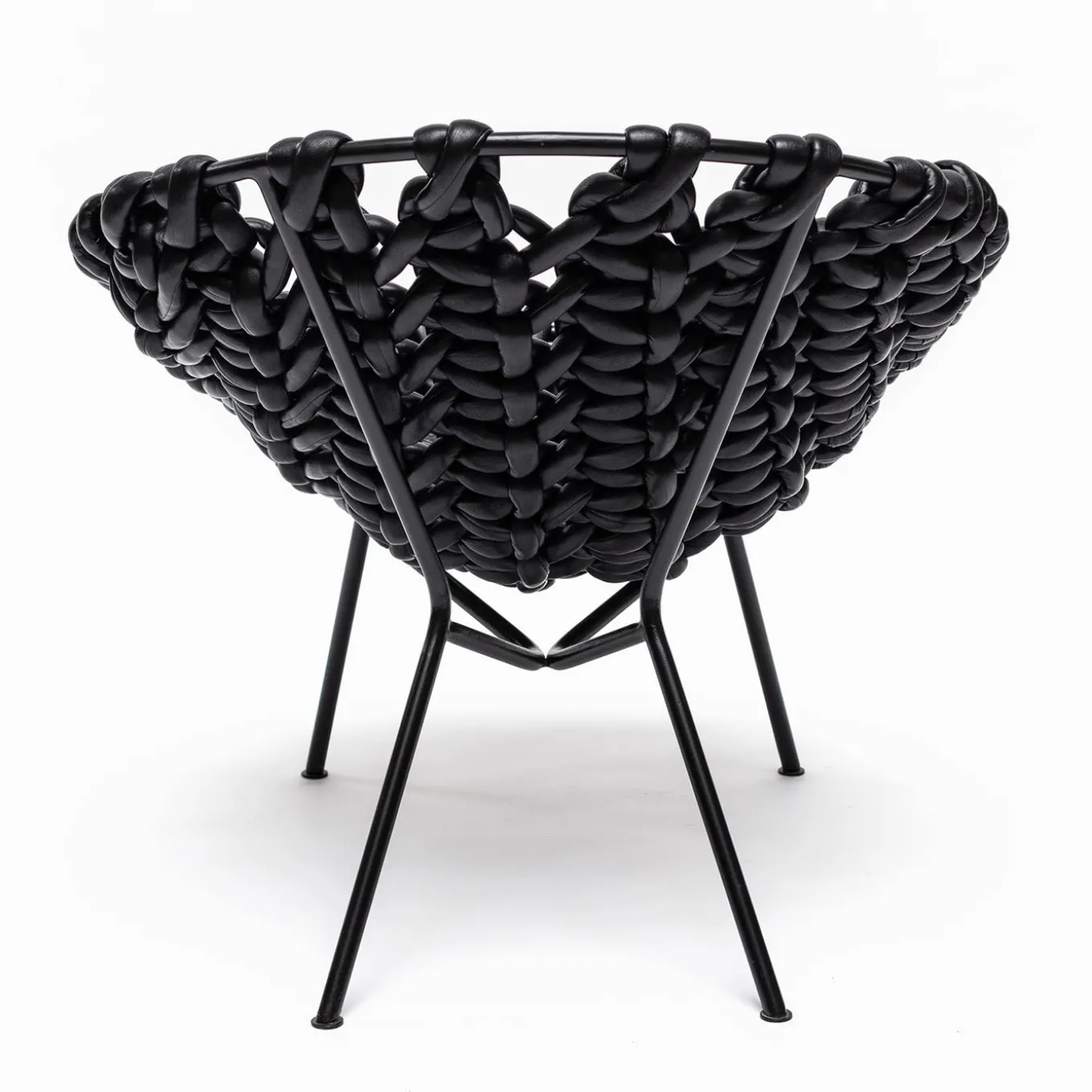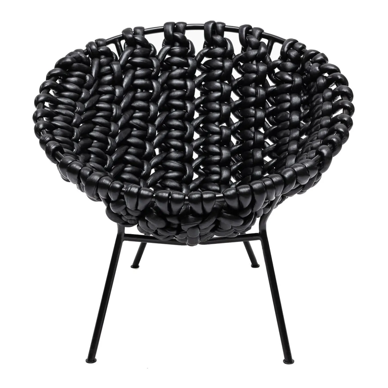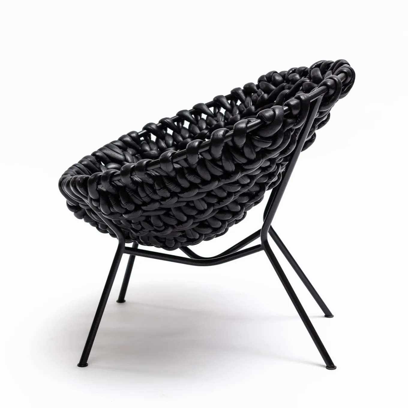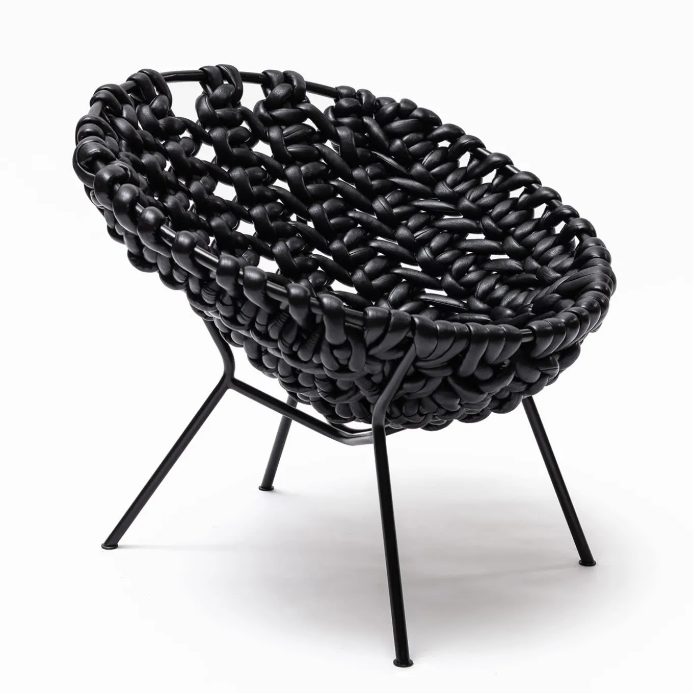 Design ispirato alle sedute da esterno con struttura metallica circolare, solitamente decorate in vimini o paglia, in voga negli anni Cinquanta. La reinterpretazione di Craafts prevede una lavorazione estremamente elaborata del pannello della seduta, che contrasta con la semplicità strutturale del tubo metallico verniciato a polvere. La lavorazione a triplo nodo, simile a un macrame, del tessuto tubolare in pelle è eseguita da esperti artigiani e garantisce una seduta confortevole e rilassante.