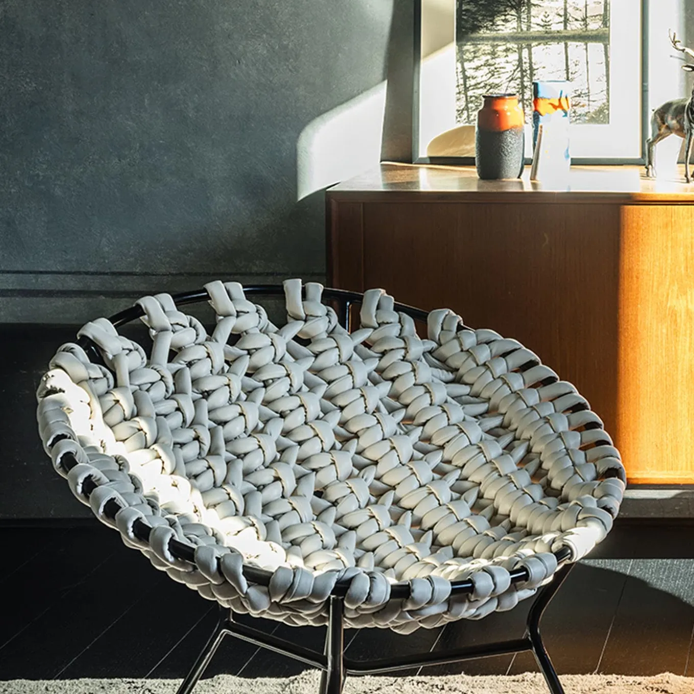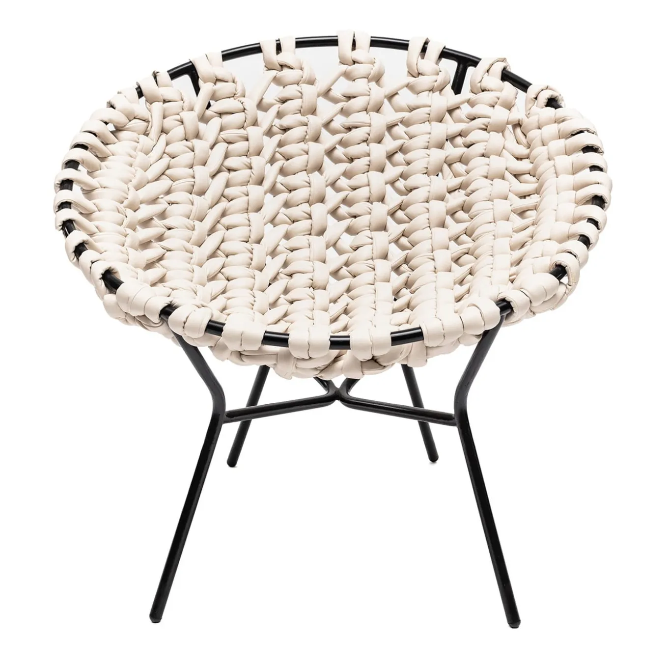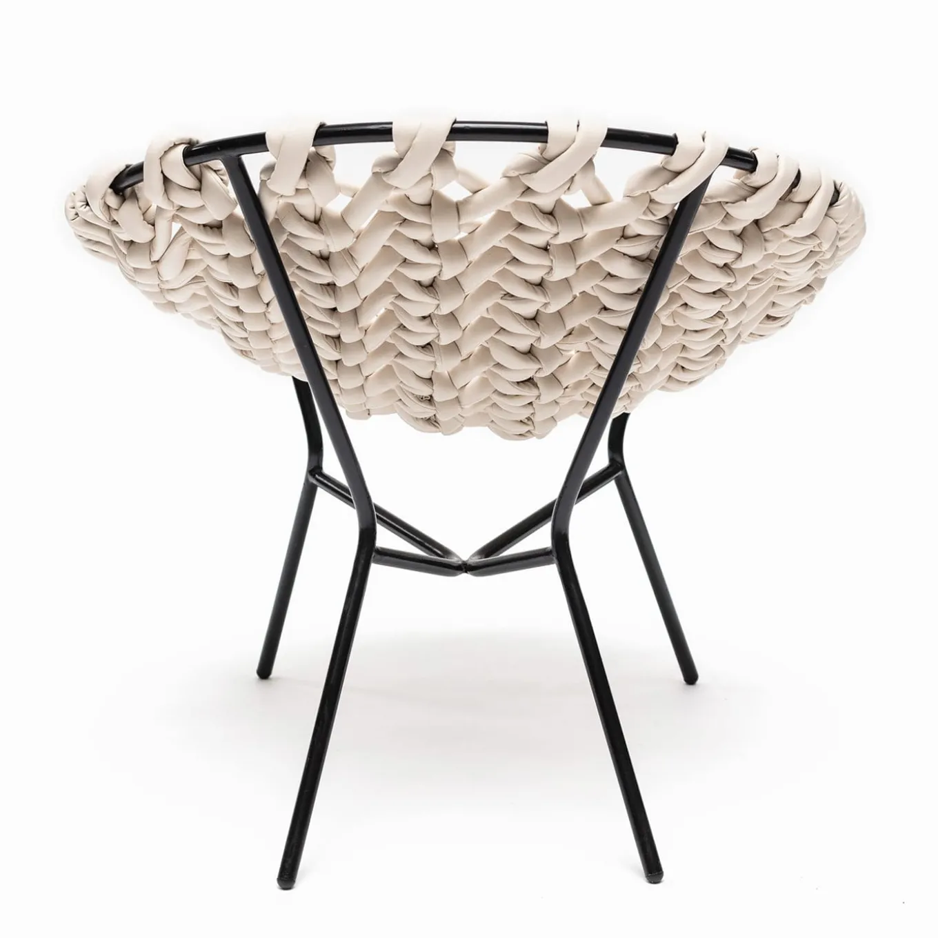 Design ispirato alle sedute da esterno con struttura metallica circolare, solitamente decorate in vimini o paglia, in voga negli anni Cinquanta. La reinterpretazione di Craafts prevede una lavorazione estremamente elaborata del pannello della seduta, che contrasta con la semplicità strutturale del tubo metallico verniciato a polvere. La lavorazione a triplo nodo, simile a un macrame, del tessuto tubolare in pelle è eseguita da esperti artigiani e garantisce una seduta confortevole e rilassante.