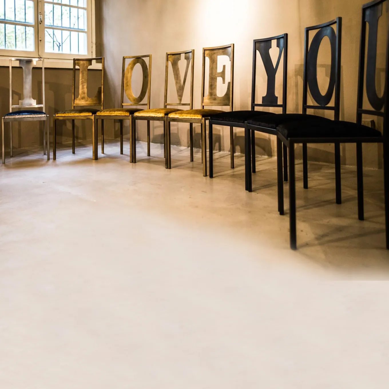 Parte della collezione Imperfect Love, l’idea progettuale di questa sedia artigianale è quella di creare un pezzo fuori dal comune che possa essere combinato con altri per scrivere la parola “F**K” o “LOVE”. Pezzo unico e originalissimo, questa sedia in ferro presenta la lettera U incorniciata nello schienale aperto e una seduta rivestita in velluto. Caratterizzata da un look total black, è lo sfondo perfetto per un arredamento eclettico e contemporaneo. Disponibile anche in finitura oro e velluto oro, blu, bronzo o grigio. Ogni pezzo è unico e, a causa della lavorazione artigianale, possono verificarsi lievi variazioni.
