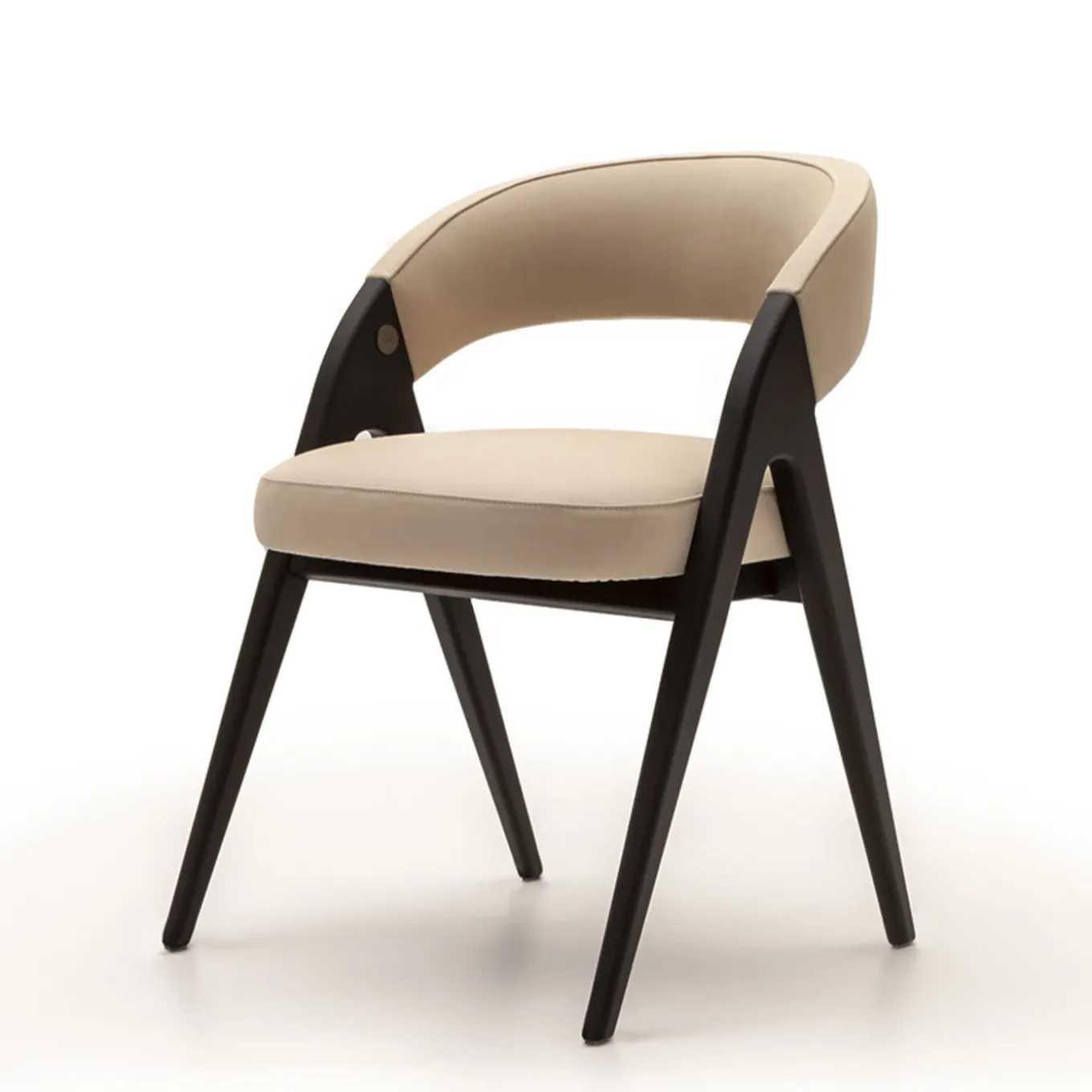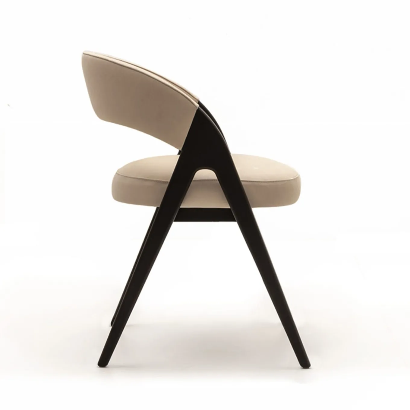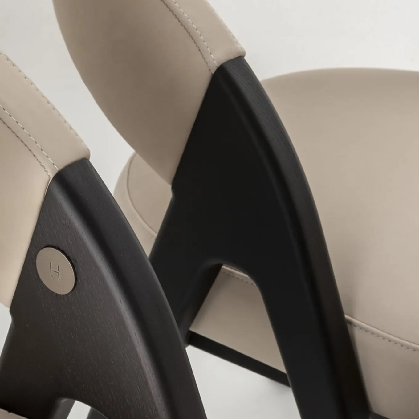Scoprite questa sedia in legno massiccio dalla riconoscibile linea retrò interpretata in chiave moderna in legno tinto nero e schienale in pelle. La composizione è un’unica linea dalle gambe a cavalletto allo schienale imbottito.