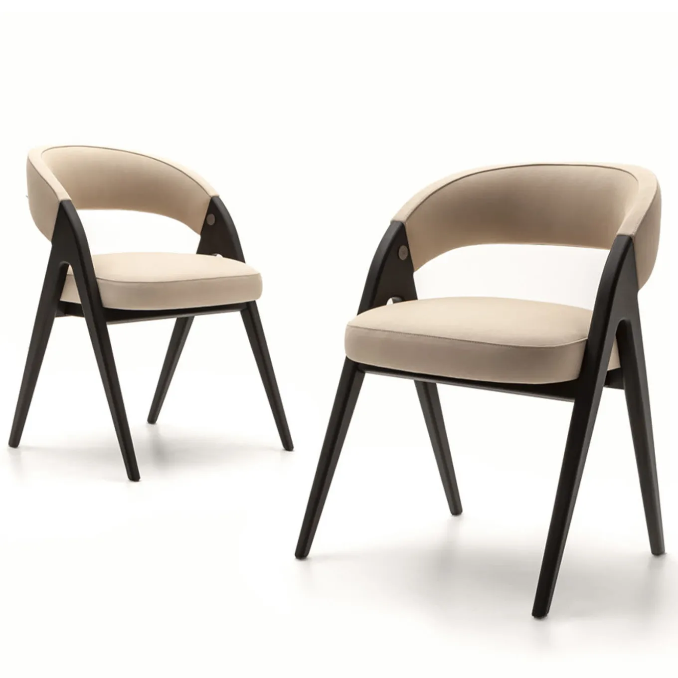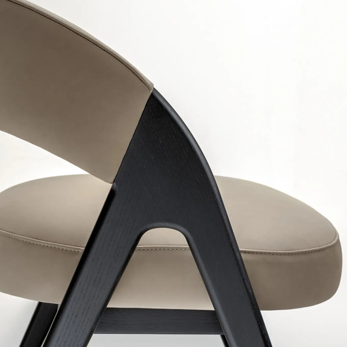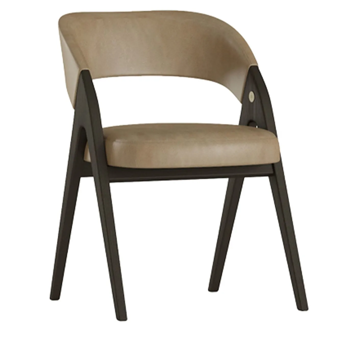 Scoprite questa sedia in legno massiccio dalla riconoscibile linea retrò interpretata in chiave moderna in legno tinto nero e schienale in pelle. La composizione è un’unica linea dalle gambe a cavalletto allo schienale imbottito.