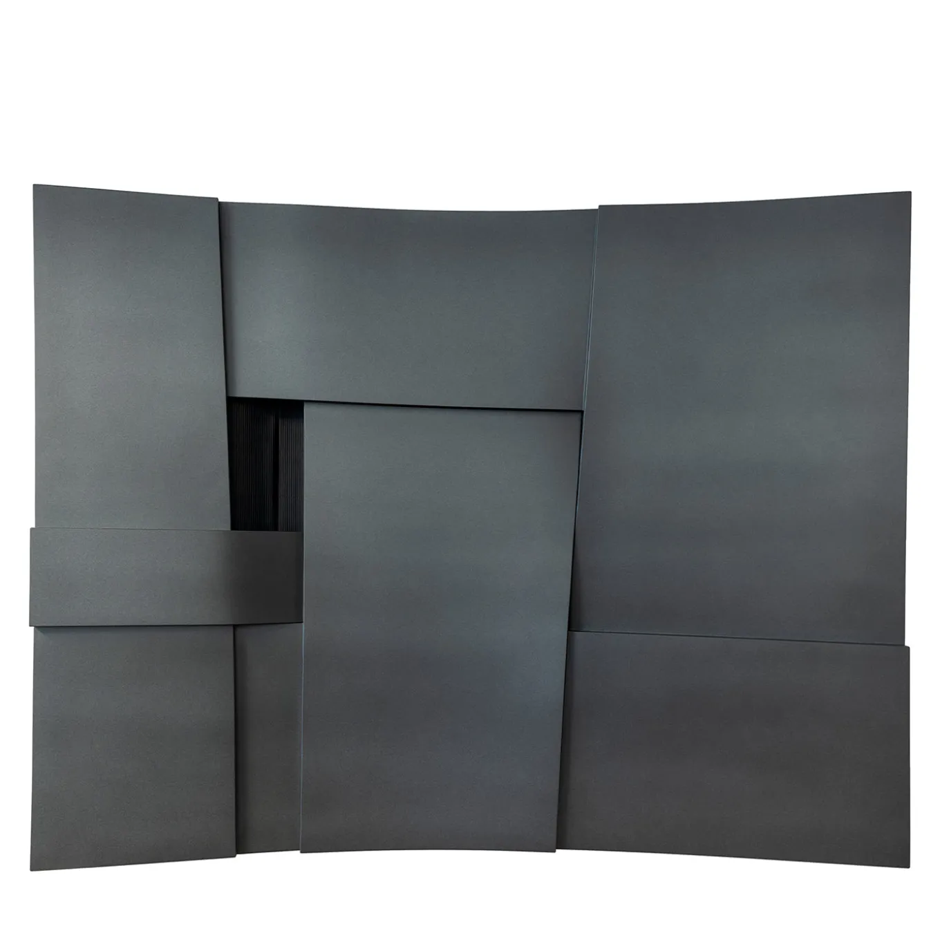 Quest’opera esplora il dualismo tra pieno e vuoto attraverso una serie di pannelli rettangolari sovrapposti, disposti in una composizione lineare leggermente torsionata. L’opera coglie la fase iniziale della costruzione della forma, in cui strati intersecanti generano un vuoto intenzionale all’interno della struttura. Il design astratto enfatizza la razionalità e le forme concrete, rendendola un’opera d’arte decorativa di forte impatto visivo. Pezzo unico.