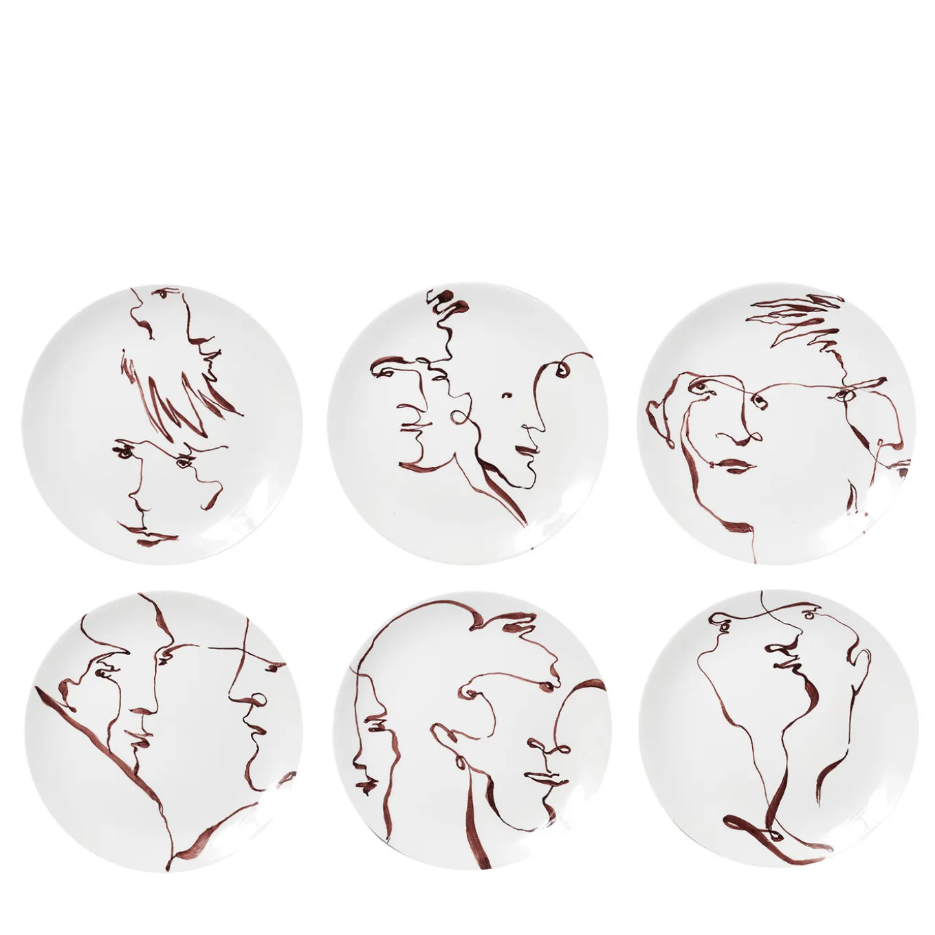 In questa Collezione lo spazio grafico del piatto è solo un punto di passaggio: le linee che tracciano i volti, realizzati nel gioco di non staccare mai la punta del pennello dal supporto, continuano al di là dei bordi, in un dialogo sfuggente tra dettagli di occhi, bocche, profili – lasciando all’immaginazione i loro pensieri, e le loro privatissime conversazioni.