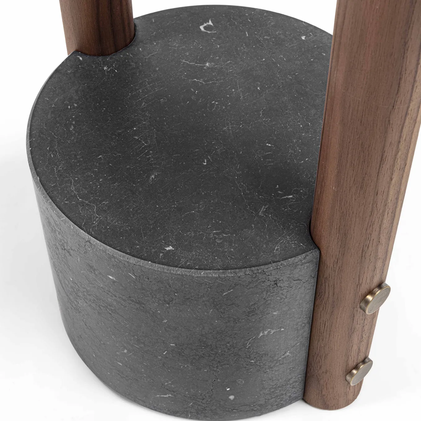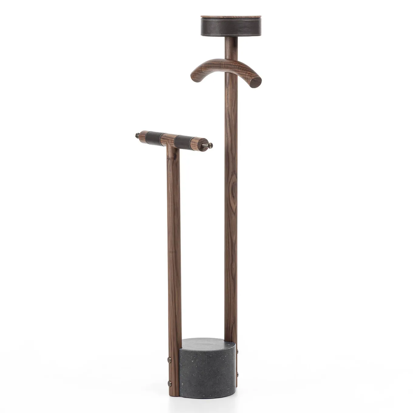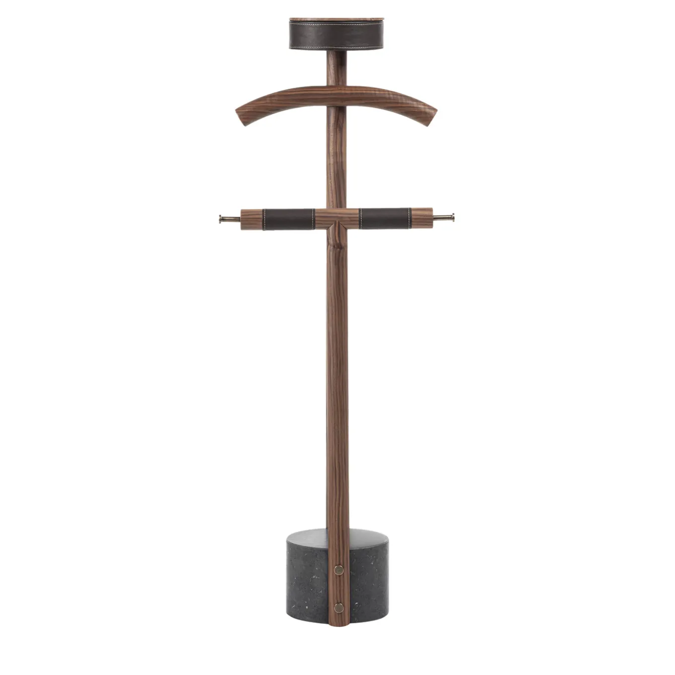 Il servomuto in legno di noce Patrick presenta una base in marmo Marquina che sorregge una struttura progettata con cura, dotata di un portapantaloni avvolto in pelle e fornita di due supporti in bronzo adatti per cinture e cravatte. La sezione superiore integra una scatola di stoccaggio foderata in pelle di alta qualità con un coperchio in legno massello, unendo funzionalità a materiali eleganti e dettagli raffinati.