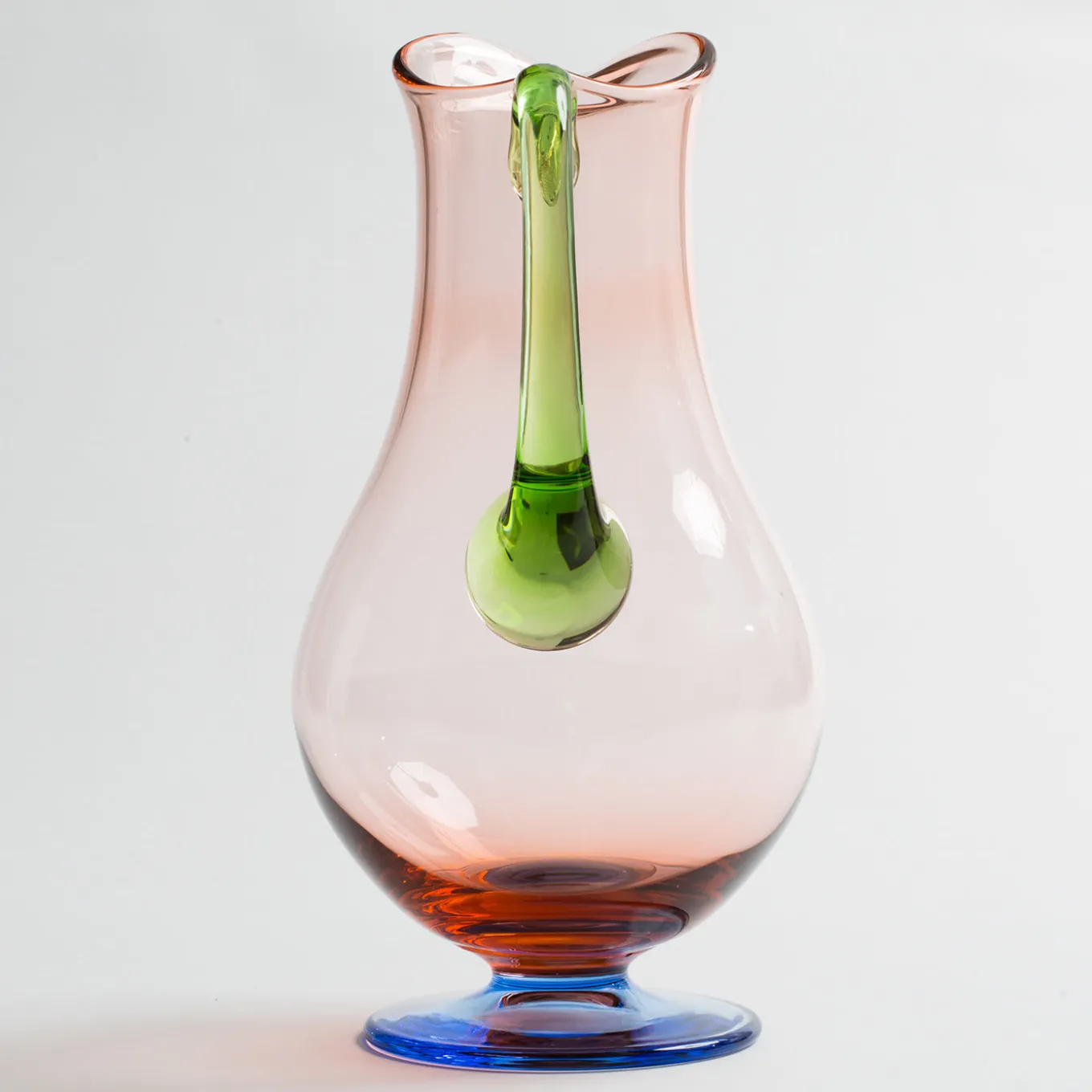 Questo set di caraffa e 3 bicchieri per Sei è caratterizzato da linee eleganti e colori vivaci, con un corpo in un bel rosa, una base in azzurro e un manico in verde.