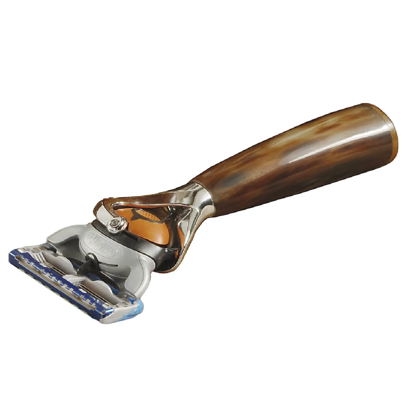 Questo squisito set da viaggio è completamente realizzato a mano e comprende un pennello da barba e un rasoio, entrambi con un prezioso manico in corno e il fondo in legno d’ebano. Il pennello è in pelliccia di tasso con punta in argento puro, diametro 18 mm. Il rasoio è un Flexball con attacco Gillette fusion. Entrambi gli elementi sono dotati di magneti per un facile aggancio ai rispettivi supporti.