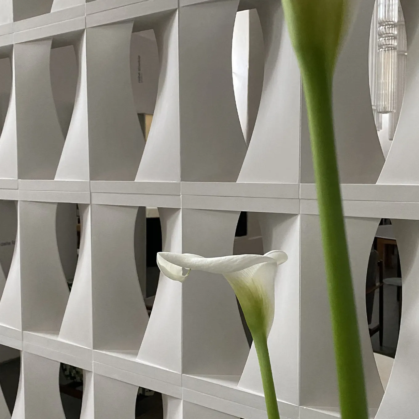 Questo screenblock si ispira alle linee audaci della Brasília degli anni ’60 di Oscar Niemeyer.I blocchi creano partizioni che mantengono la continuità visiva tra gli spazi, combinando curve complesse con forme geometriche pure. Progettati per essere posizionati stabilmente su una base rialzata, i blocchi possono essere verniciati in qualsiasi colore dopo l’installazione. Con un trattamento protettivo, sono adatti anche ad ambienti esterni. Il prezzo visualizzato si riferisce all’ordine minimo di 0,9 m² (3 confezioni da 5 blocchi ciascuna).