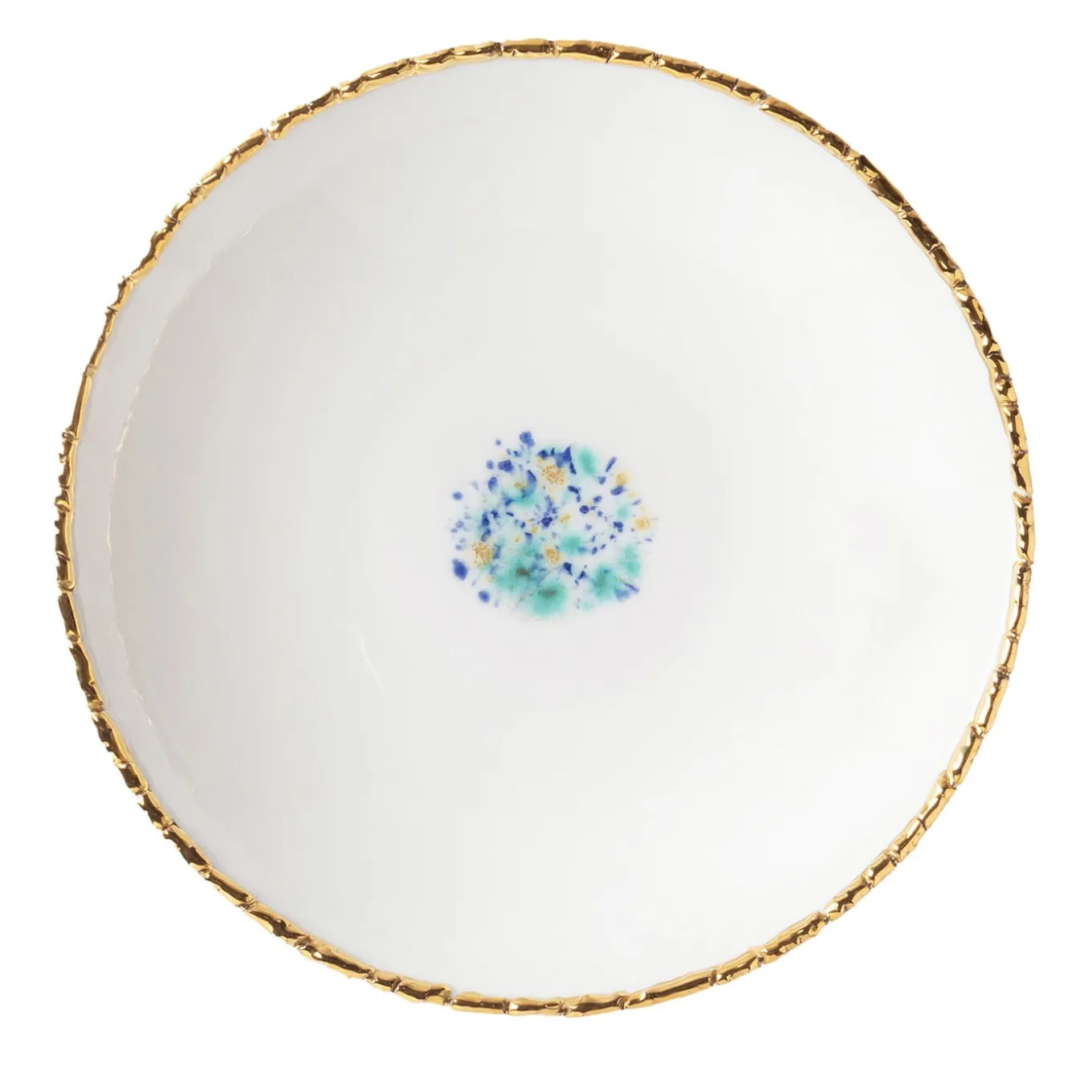 Presentato per la prima volta alla Milano Design Week 2018, l’affascinante design che contraddistingue questo set di due piatti fondi in fine porcellana vanta una deliziosa decorazione a macchie di colore blu e verde che adorna il centro. Un’ipnotica bordura craquelure in foglia d’oro 24 carati aggiunge un tocco opulento al loro fascino contemporaneo. Dipinti minuziosamente a mano, le differenze rispetto all’articolo illustrato sono da aspettarsi e da apprezzare. Non adatto al microonde.
