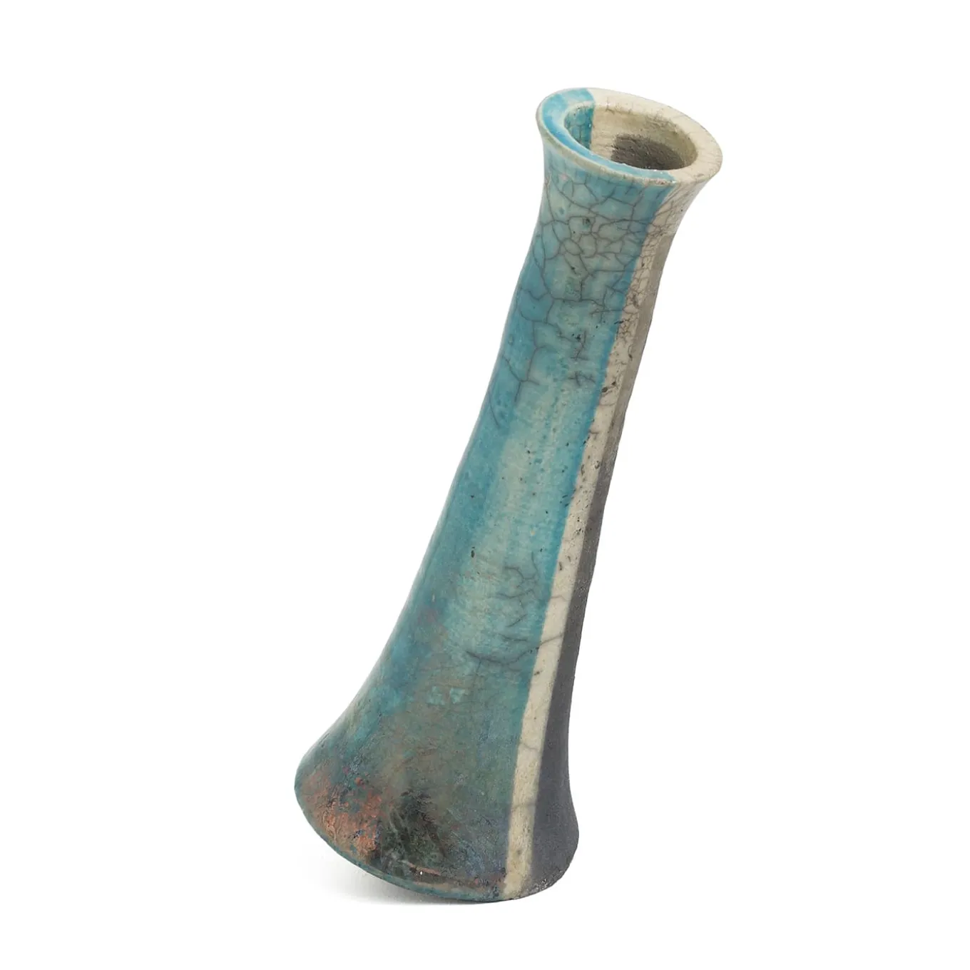 I colori principali di questi portacandele sono il turchese e il crackle, ma l’effetto nero e bruciato è presente sia all’esterno dei pezzi che all’interno della bocca che regge le candele. Un simbolo di impermanenza sotto la luce fioca di una candela.