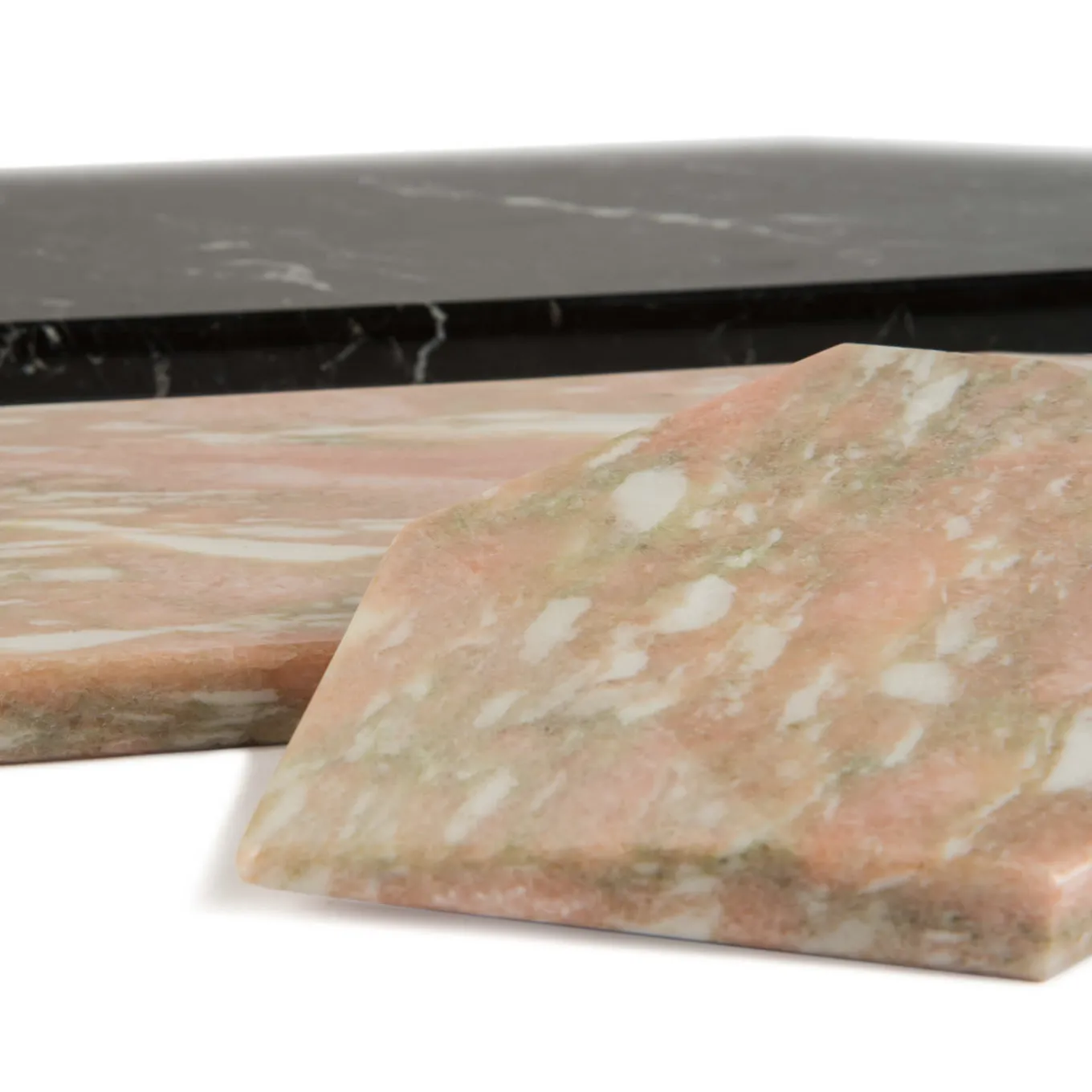 Questo splendido set di due sottobicchieri è stato realizzato a mano in marmo rosa di Norvegia. Entrambi i pezzi presentano una forma esagonale irregolare che evoca l’eleganza dei diamanti, con una superficie sfaccettata in due finiture: una opaca e una lucida. Notevolmente sottili e leggeri, questi due pezzi sono molto resistenti e possono essere utilizzati come sottobicchieri, tappetini resistenti al calore o accenti decorativi in una casa classica o contemporanea. Questo set è stato presentato alla Milano Design Week 2018 ed è disponibile anche in marmo nero Marquina.