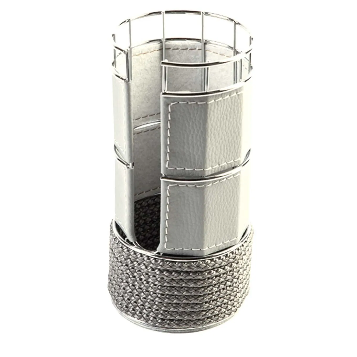 Arricchito da dettagli eleganti, questo portabicchieri di carta farà bella mostra di sé su qualsiasi tavolo, sia in occasione di incontri formali che informali. Unico e funzionale, il suo corpo cilindrico ha una struttura a griglia in metallo con finitura cromata e un’apertura verticale che ne facilita l’uso e la funzionalità. La base è arricchita da una corda di colore grigio argento, come l’ecopelle che riveste i lati del pezzo.