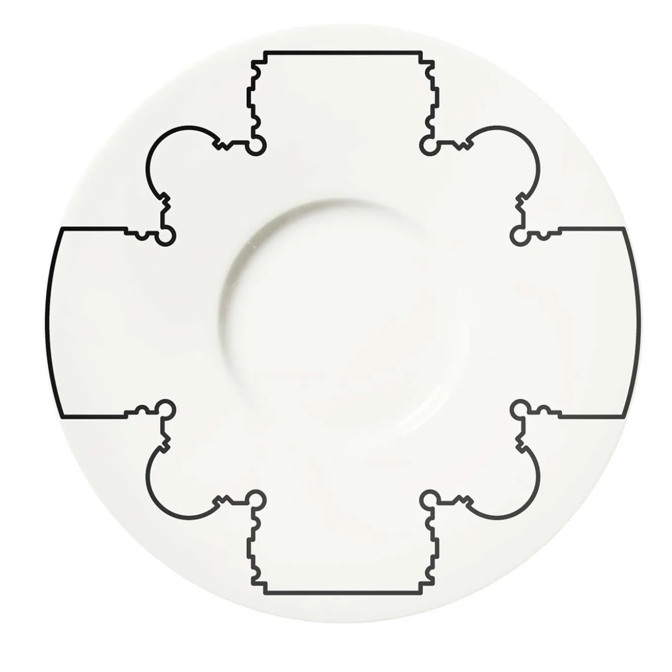 Il fascino unico delle chiese barocche siciliane si esprime in questo esclusivo set di tazzina e piattino da caffè espresso in chiave moderna. Sapientemente realizzato in porcellana bianca, vanta minuscole decorazioni nere che raffigurano la grafica stilizzata di elementi architettonici barocchi, rendendo la vera essenza artistica di questo raffinato set.