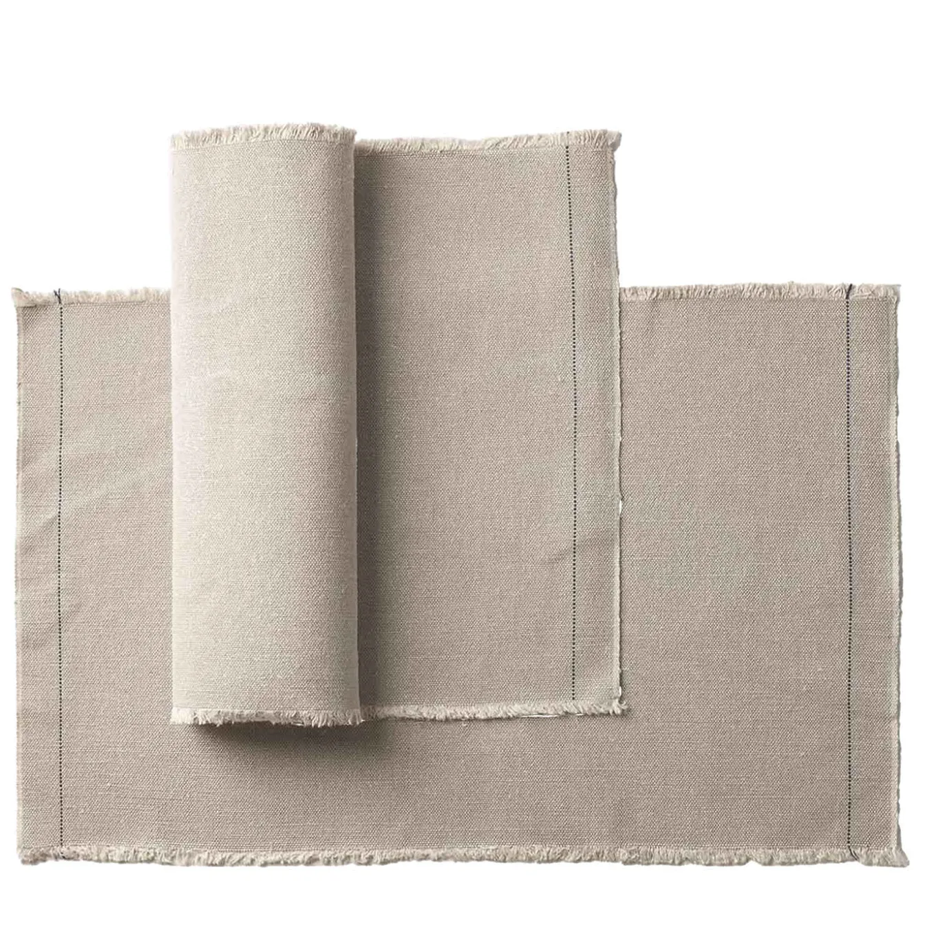 Le tovagliette Amerigo sono realizzate con i 260 metri di tessuto rimanenti utilizzati per le vele del veliero Amerigo Vespucci del 2012. Le vele sono state prodotte nel 2012 in una storica tessitura del Nord Italia. La linea blu che attraversa il tessuto serve da guida per le cuciture. Quando è bagnata, la stoffa è rigida, ma una volta asciutta ritorna alla sua morbida consistenza originale. Ogni pezzo è realizzato a mano dalle donne di una veleria dell’Isola delle Femmine.