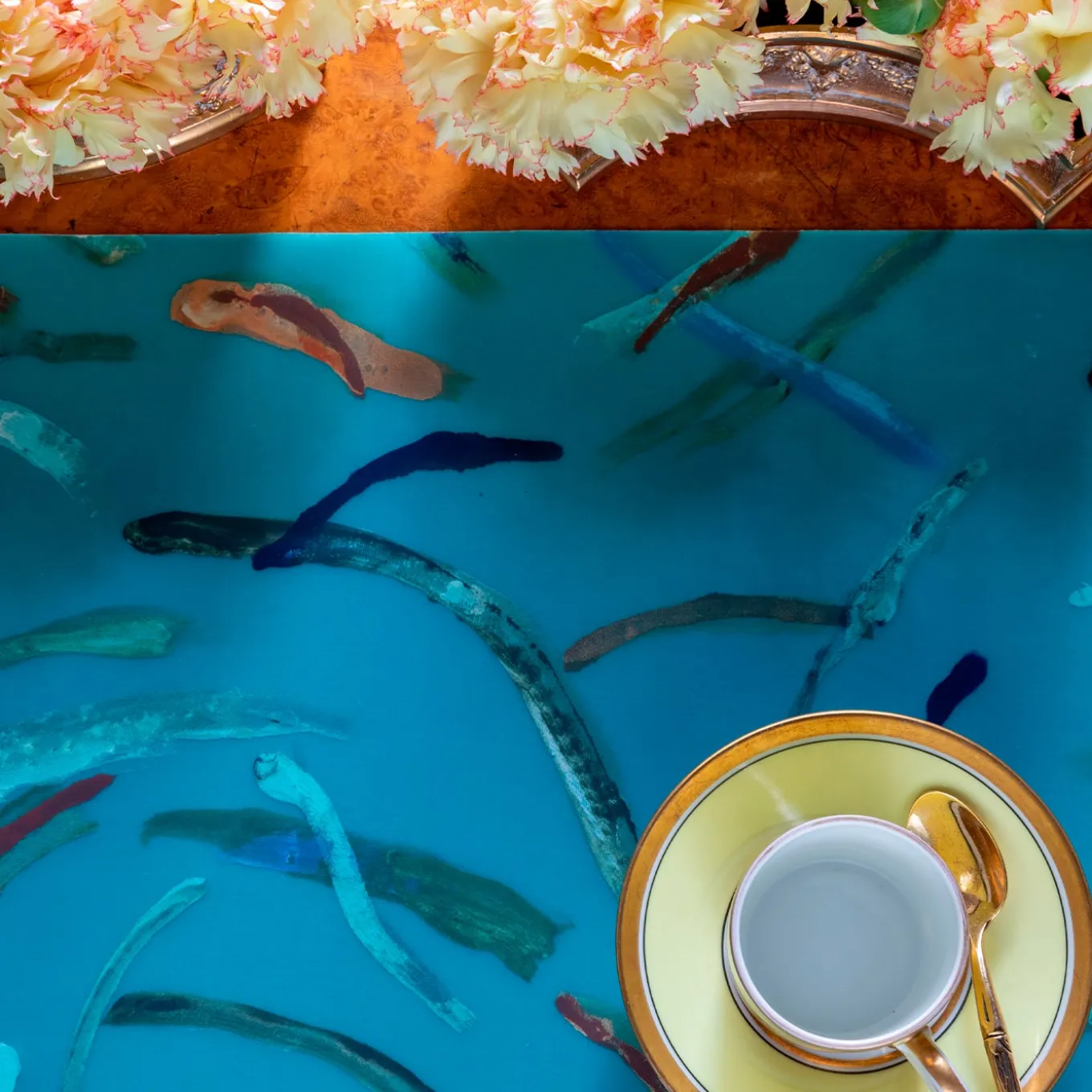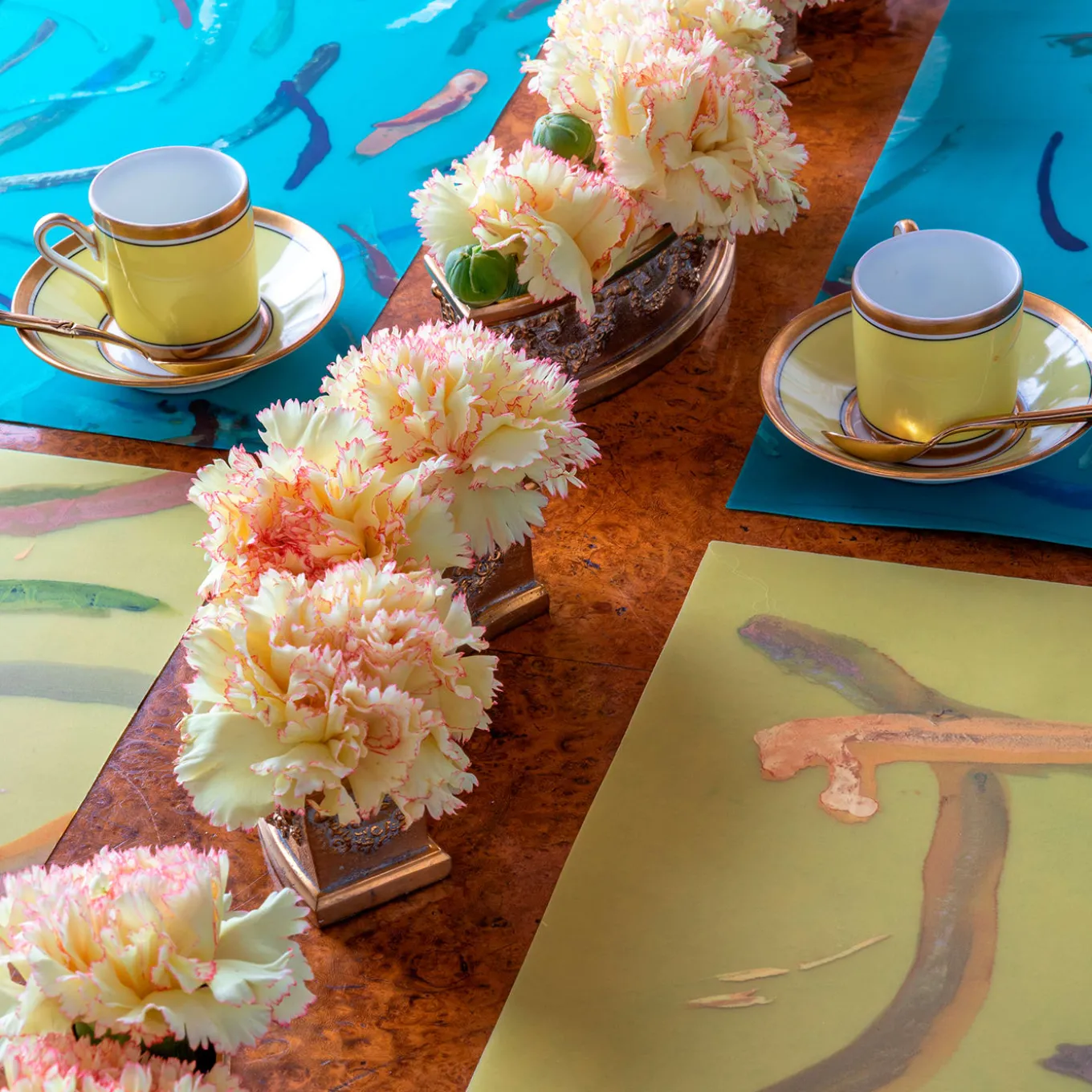 La preziosa opera d’arte originale di Luisa Longo, dipinta a mano su organza di seta con colori misti metallici e cangianti, è incorporata in un’esclusiva soluzione poliuretanica dalla morbidissima sensazione di pelle di pesca. I sottobicchieri hanno una straordinaria resistenza al calore, alle abrasioni e alle macchie, sono leggeri e totalmente flessibili, possono essere lavati semplicemente con una goccia d’acqua e sapone. La base in organza di seta conferisce una sensazione ancora più morbida al tatto e gli effetti del pennello dell’artista e la sua esperienza cromatica vengono messi in grande risalto. tovaglioli 100% lino