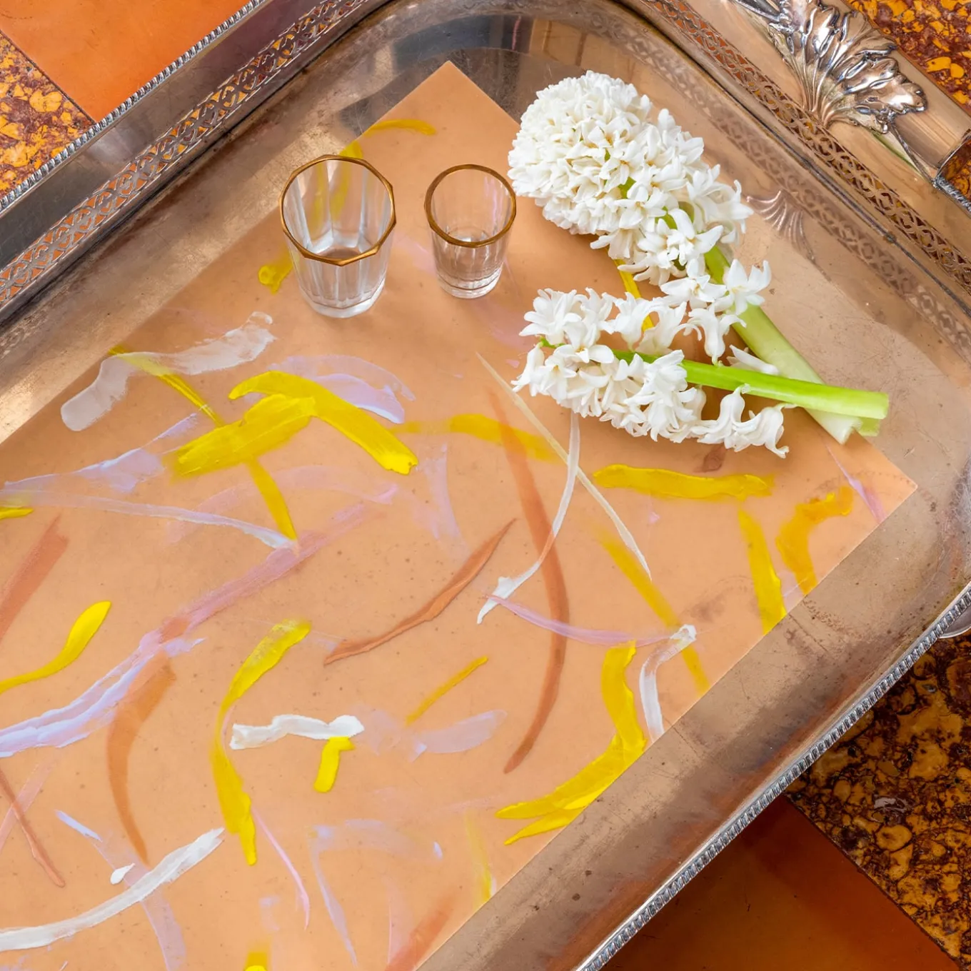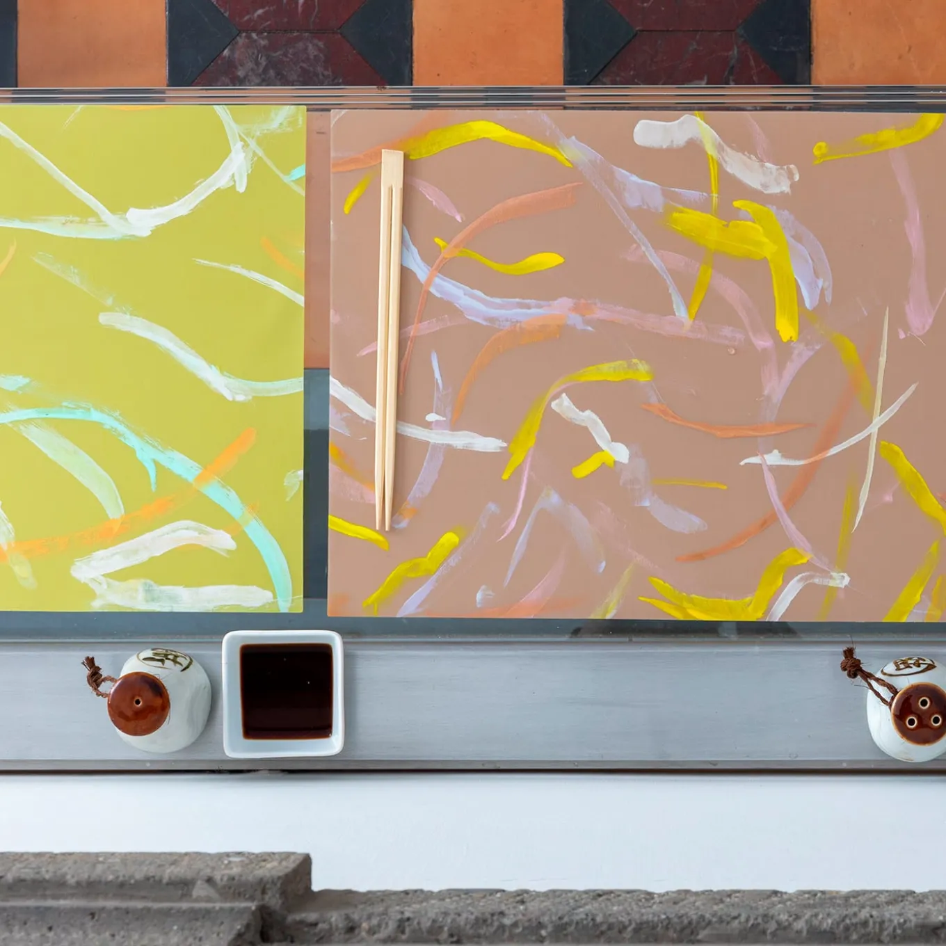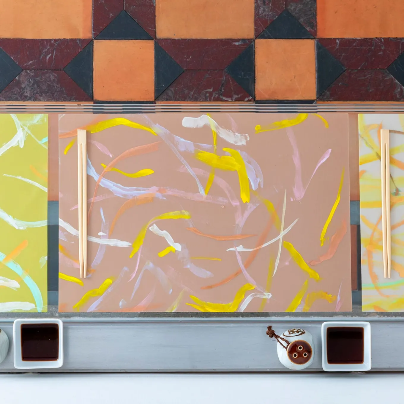 Le preziose opere d’arte originali di Luisa Longo, dipinte a mano su organza di seta con colori misti, metallici e cangianti, sono incorporate in un’esclusiva soluzione poliuretanica dalla morbidissima sensazione di pelle di pesca. Le tovagliette hanno una straordinaria resistenza al calore, alle abrasioni e alle macchie, sono leggere e totalmente flessibili, possono essere lavate semplicemente con una goccia d’acqua e sapone. La base in organza di seta conferisce una sensazione ancora più morbida al tatto e gli effetti del pennello dell’artista e la sua esperienza cromatica vengono messi in grande risalto.