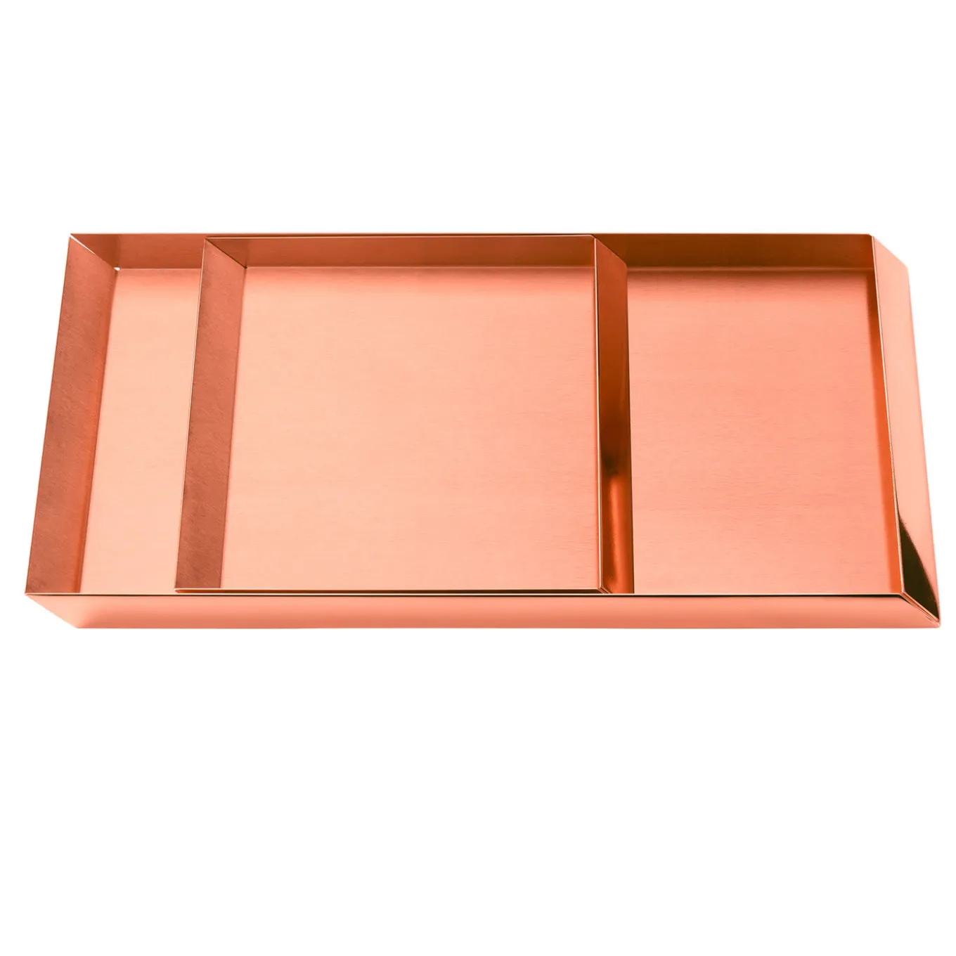 Parte della collezione Axonometry, questo set di due vassoi è definito da un profilo audace e sofisticato. Entrambi i pezzi sembrano creare l’immagine planare di rettangoli tridimensionali con effetti ipnotici, sia se utilizzati come superfici espositive per oggetti da collezione su un tavolino o una console, sia come eleganti vassoi per servire cibi e bevande in un salotto o una sala da pranzo moderni. La finitura di questi pezzi in ottone in oro rosa infonde un accento affascinante con eleganti bagliori quando cattura la luce circostante.